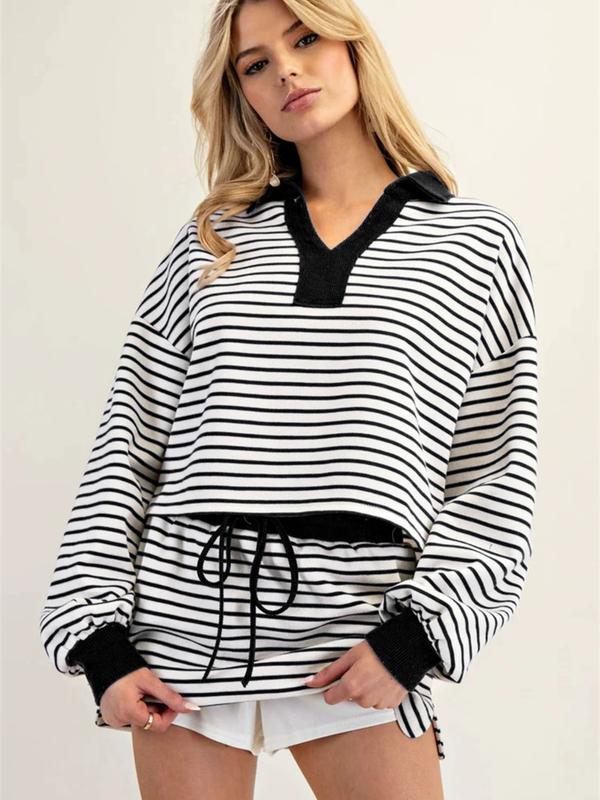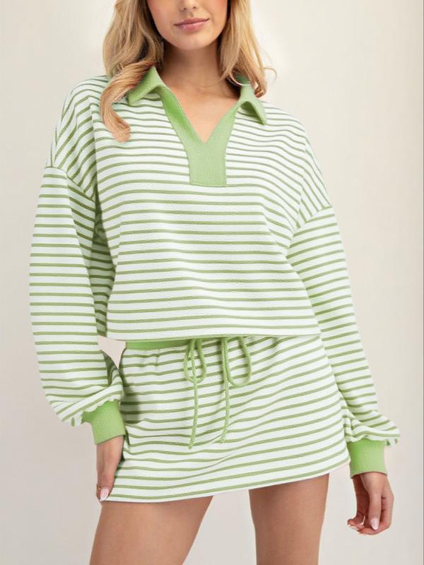 Women's Fashion Casual Striped Knit Top & Drawstring Waist Skirt Set, Loose Fit Home Wear, Comfortable Two-Piece