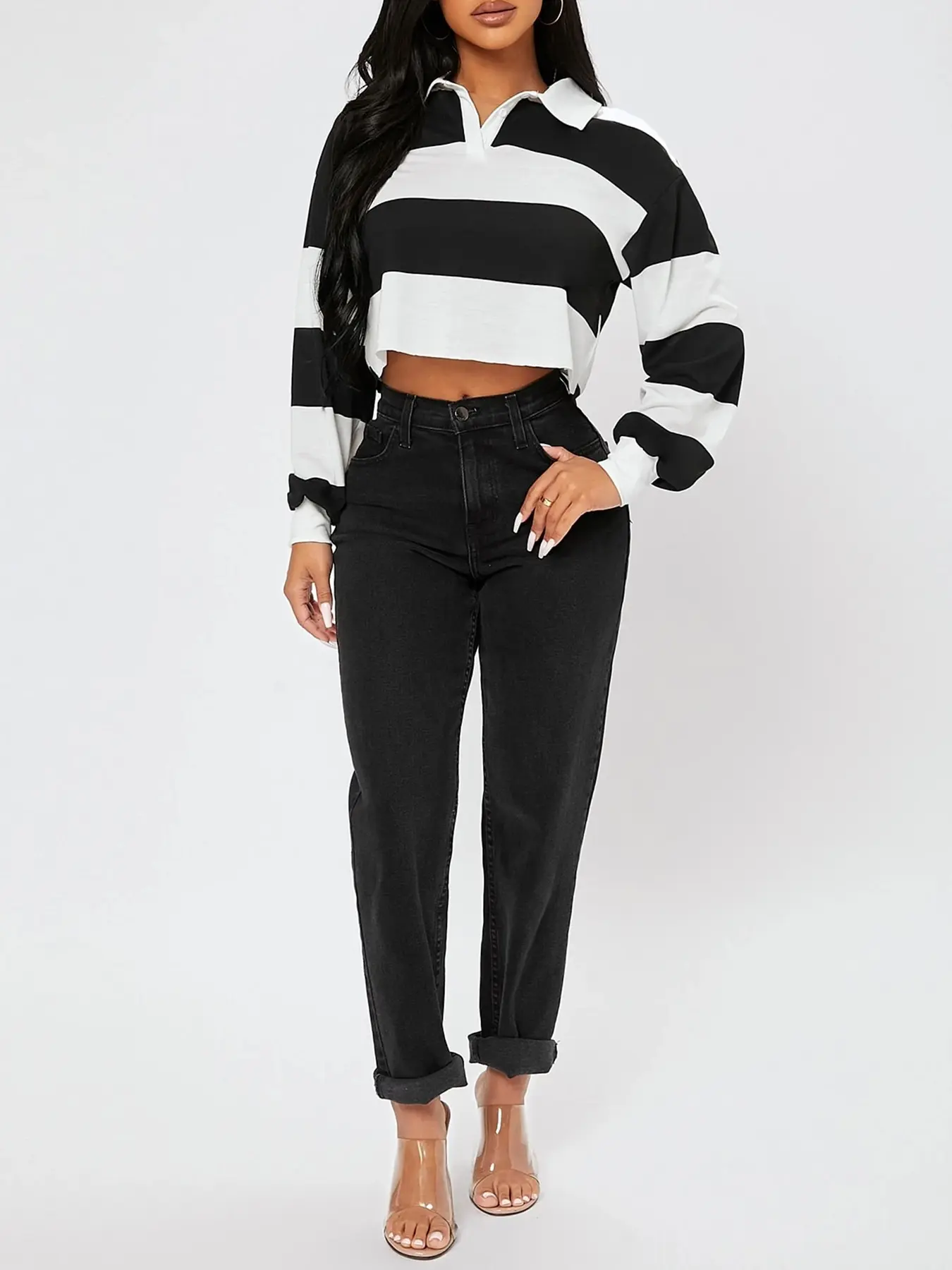 Women's Casual Striped Long Sleeve Shirt Collar Top, Fitted Woven Fabric, All Season Wear, Comfortable Commuter Style Tee #womenssweatshirtset #fashionablewomensclothing #blousesfashion #sweaterforwork #longsleevessweater #tanktopgarments #allblackoutfitswomen #holidayblouses #womenshalloweentshirt #winterblouses
