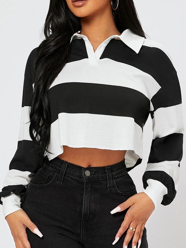 Women's Casual Striped Long Sleeve Shirt Collar Top, Comfortable Fitted Woven Fabric, All Season Wear, Perfect Commuter Tee #fashionablewomensclothing #footballcrewneck #womensclothingtiktokshop #womenshirt #womensweartrend #blousesfashion #sweaterforwork #fashiontops #widenecksweater #oversizelongsleeve