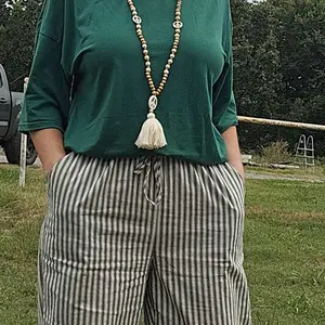 Cute pants. They are not polyester. More like cotton material. They washed well and did not wrinkle. Stylish and comfy.
