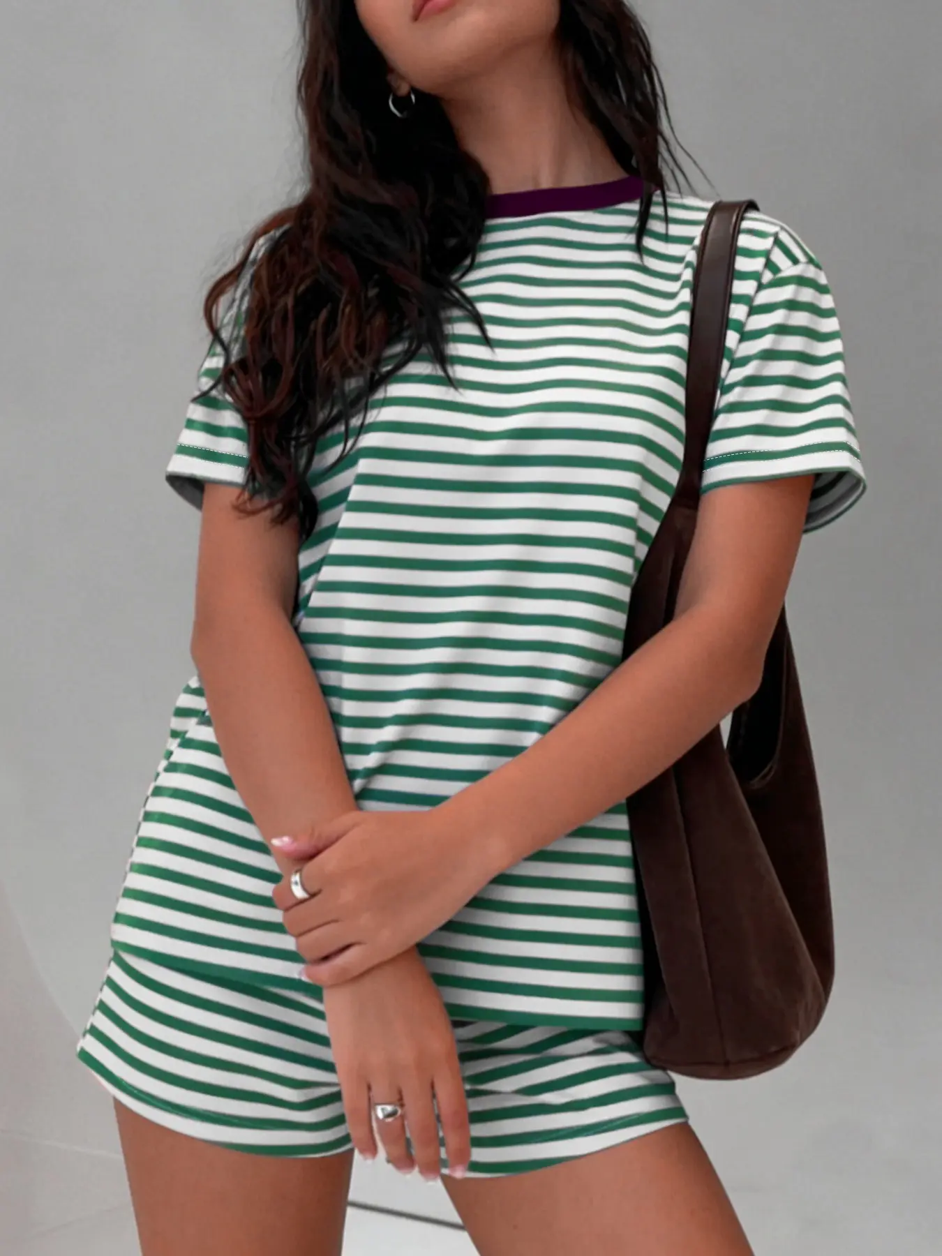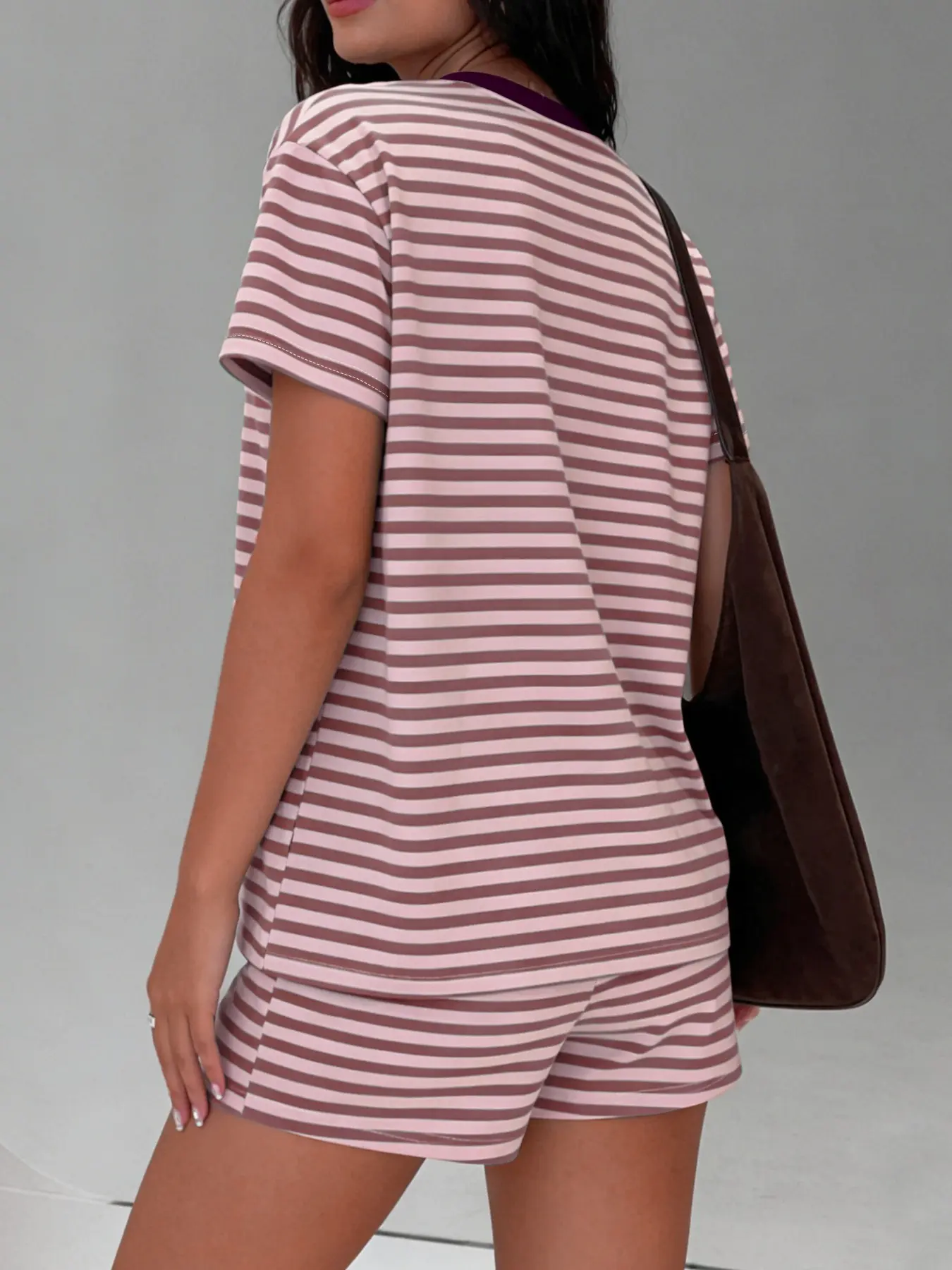 5. Women's Loose Short Sleeve Striped Top + Casual Striped Shorts Set Outfit, Travel, Fitted Style, All Seasons, Regular Length
