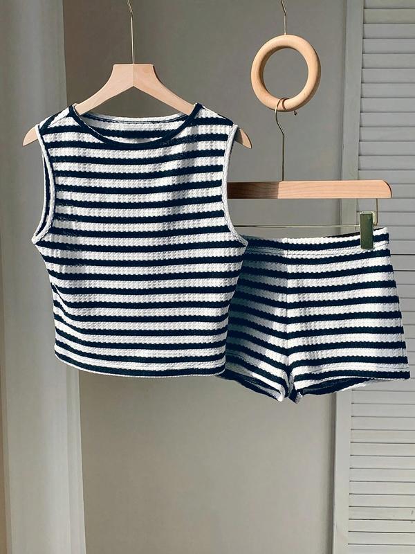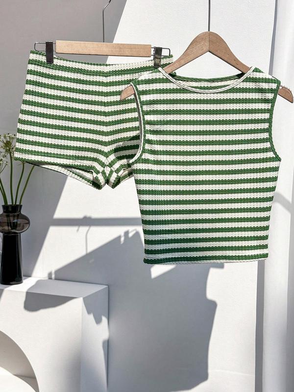Two-piece Set Women's Striped Pattern  Tank Top & Shorts, Casual Sleeveless Round Neck Top & Shorts for Summer, Ladies Clothes for Daily Wear, Knitted Shorts Set