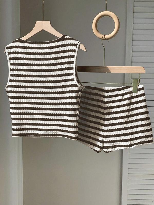 5. Two-piece Set Women's Striped Pattern Tank Top & Shorts, Casual Sleeveless Round Neck Top & Shorts for Summer, Ladies Clothes for Daily Wear, Knitted Shorts Set