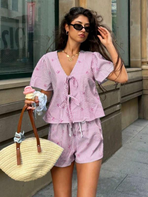 Two-Piece Set Women's Striped Print Tie Front Shirt & Shorts, Casual Short Sleeve Top & Shorts for Daily Wear, Ladies Two-piece Set for All Seasons, Clothes