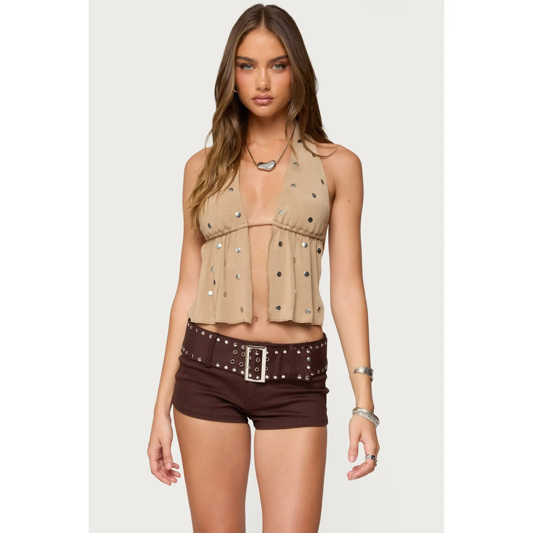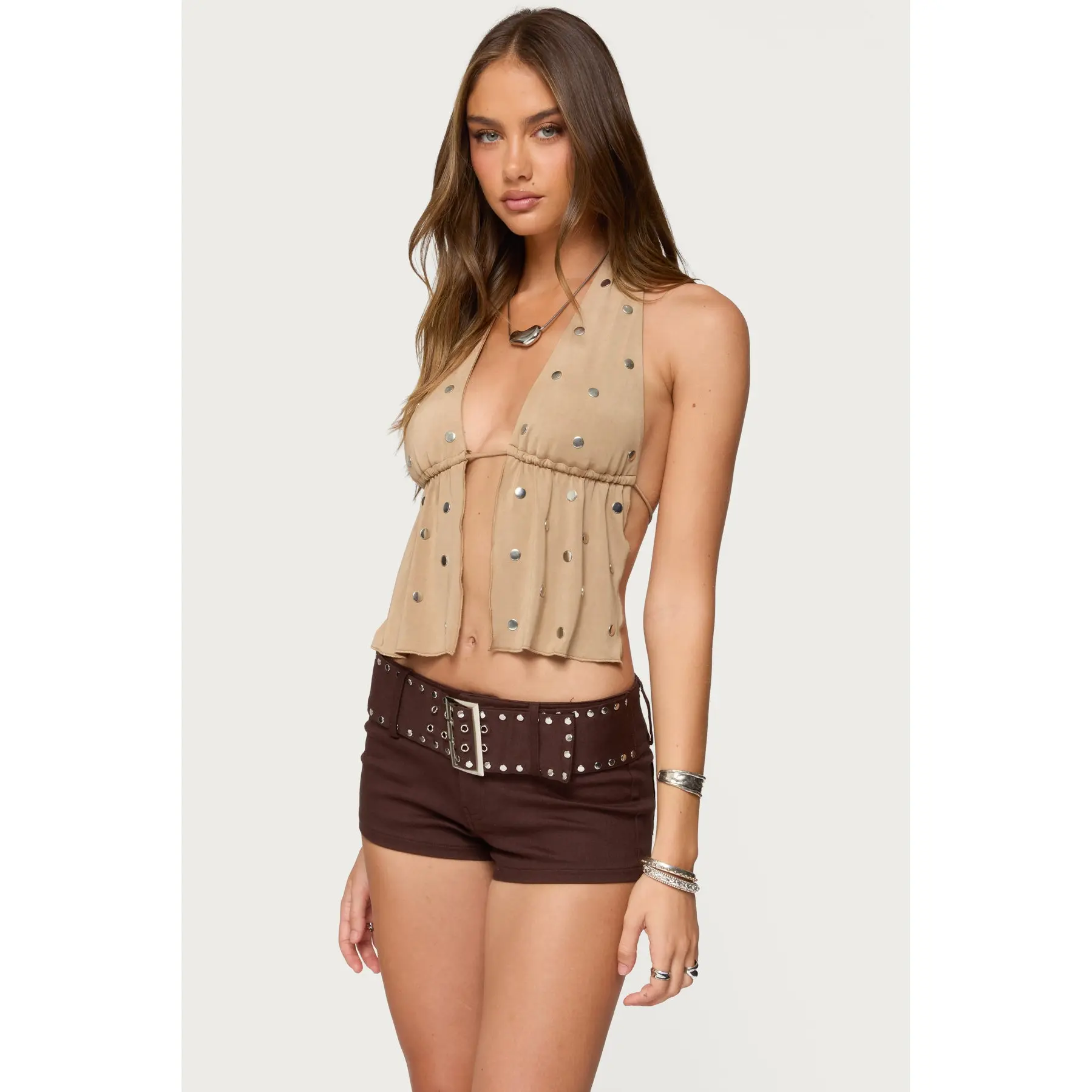 Studded Split Front Backless Halter Top