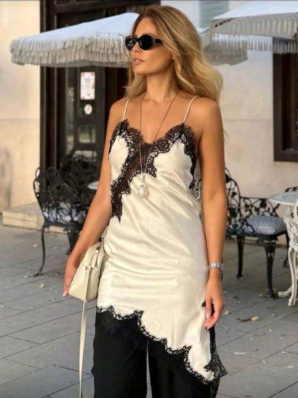 Women's Summer Asymmetrical Beach Midi Dress, Lace Strapless Satin Long Dress, Elegant Formal Sleeveless Patchwork Dress, Lace Trim Dress