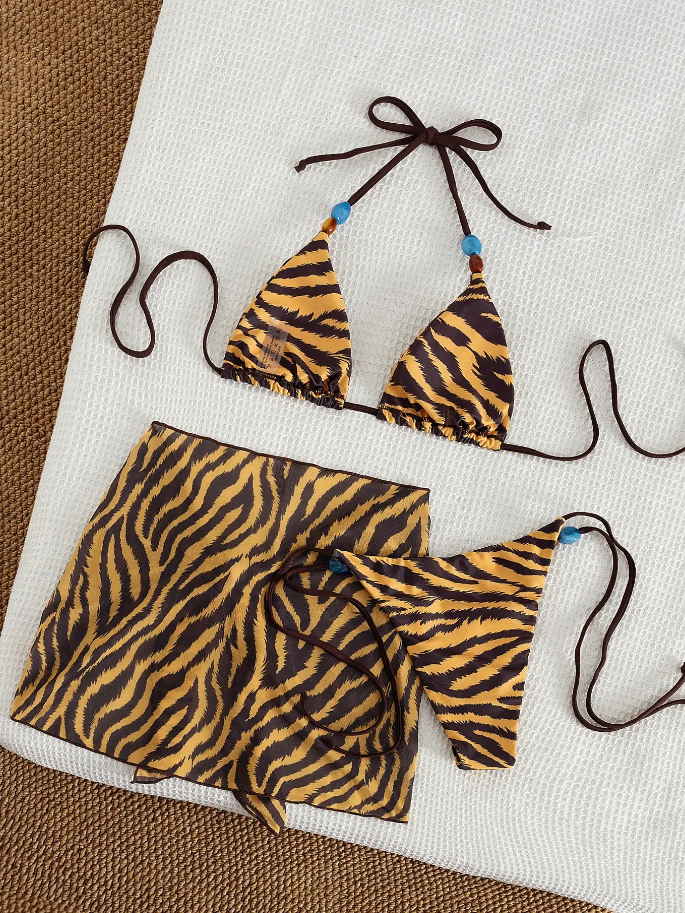 Women's summer beach brown three-piece tie back bikini suit, tiger skin print triangle halter top and side lace-up bottoms plus mesh skirt, seductive sexy swimsuit suitable for women, holiday pool party fashion swimsuit, Wrapped Bikini Set