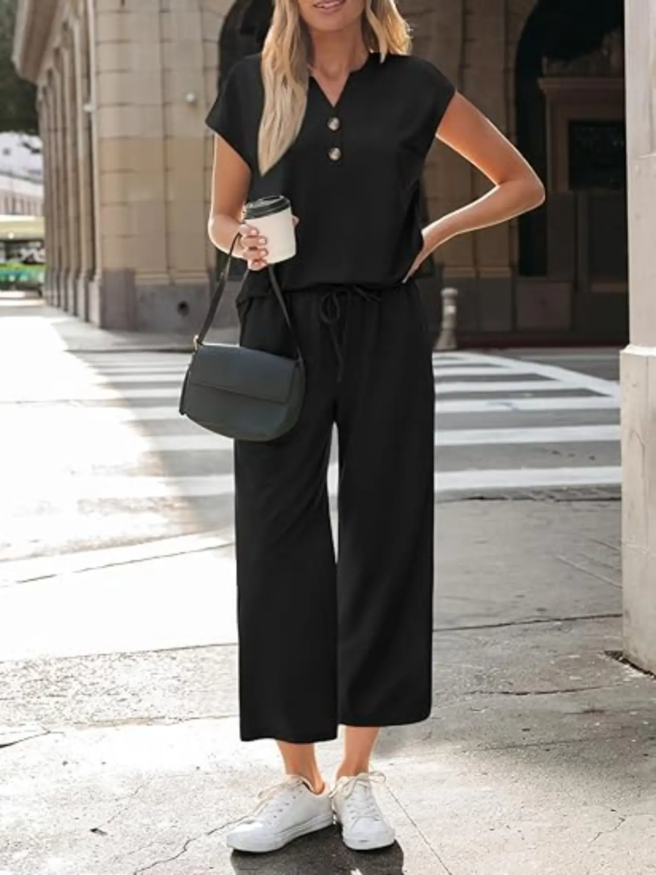 Women's Summer Casual 2-Piece Set, Short Sleeve Button Top & Elastic Waist Pants#twopieceset #casualoutfits #tiktokshop #OOTD #spotlightfinds