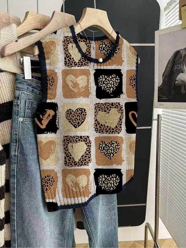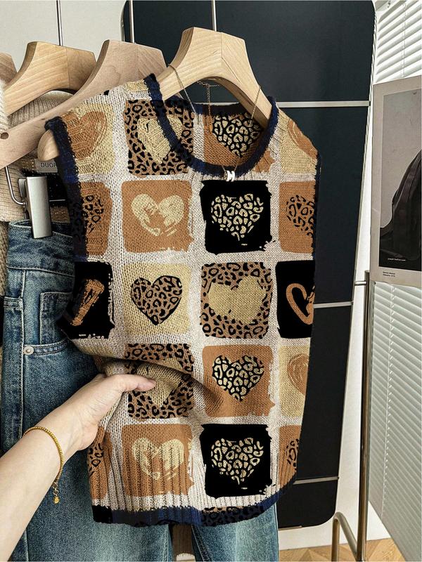 5. 1 piece + Spring/Summer Back-to-School Casual Style Loose Round-neck Sleeveless Knitted Color-Contrasting Dark Blue Embroidered Checkered Heart Print Valentine's Day Knit Top for Women, suitable for wearing alone or paired with a jacket for an outfit.