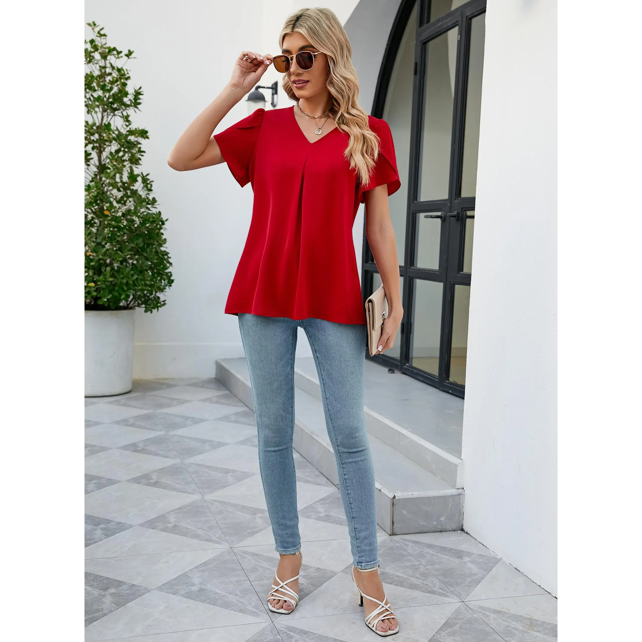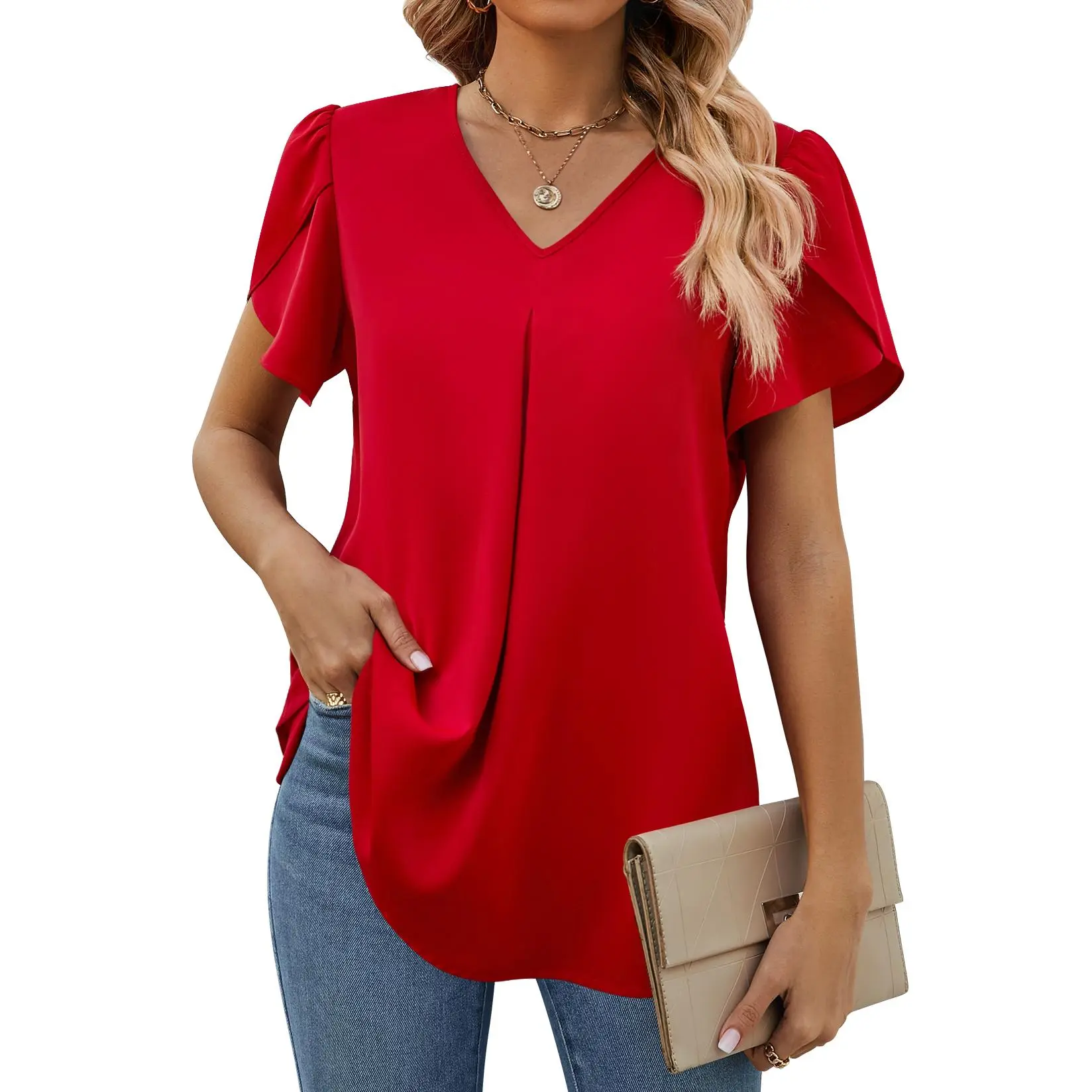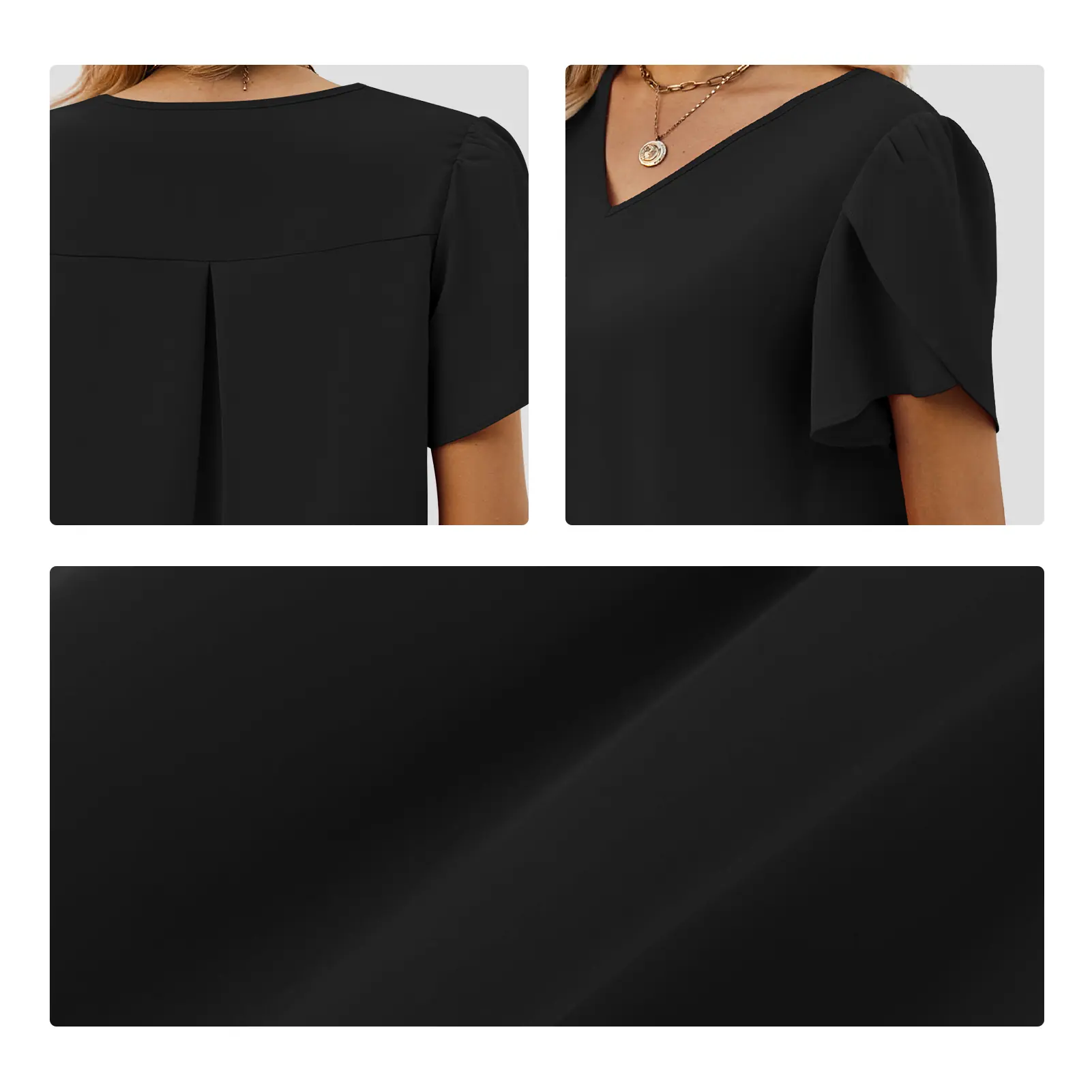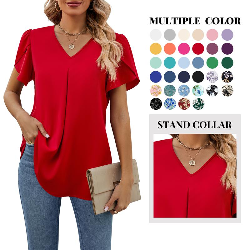 🌸 Dressy chiffon blouse with a V-neck and tulip petal sleeves. Pleated stitched a-line design in the front and back. Loose-fitting to hide tummy, making you look slimmer and trendy. 🌸