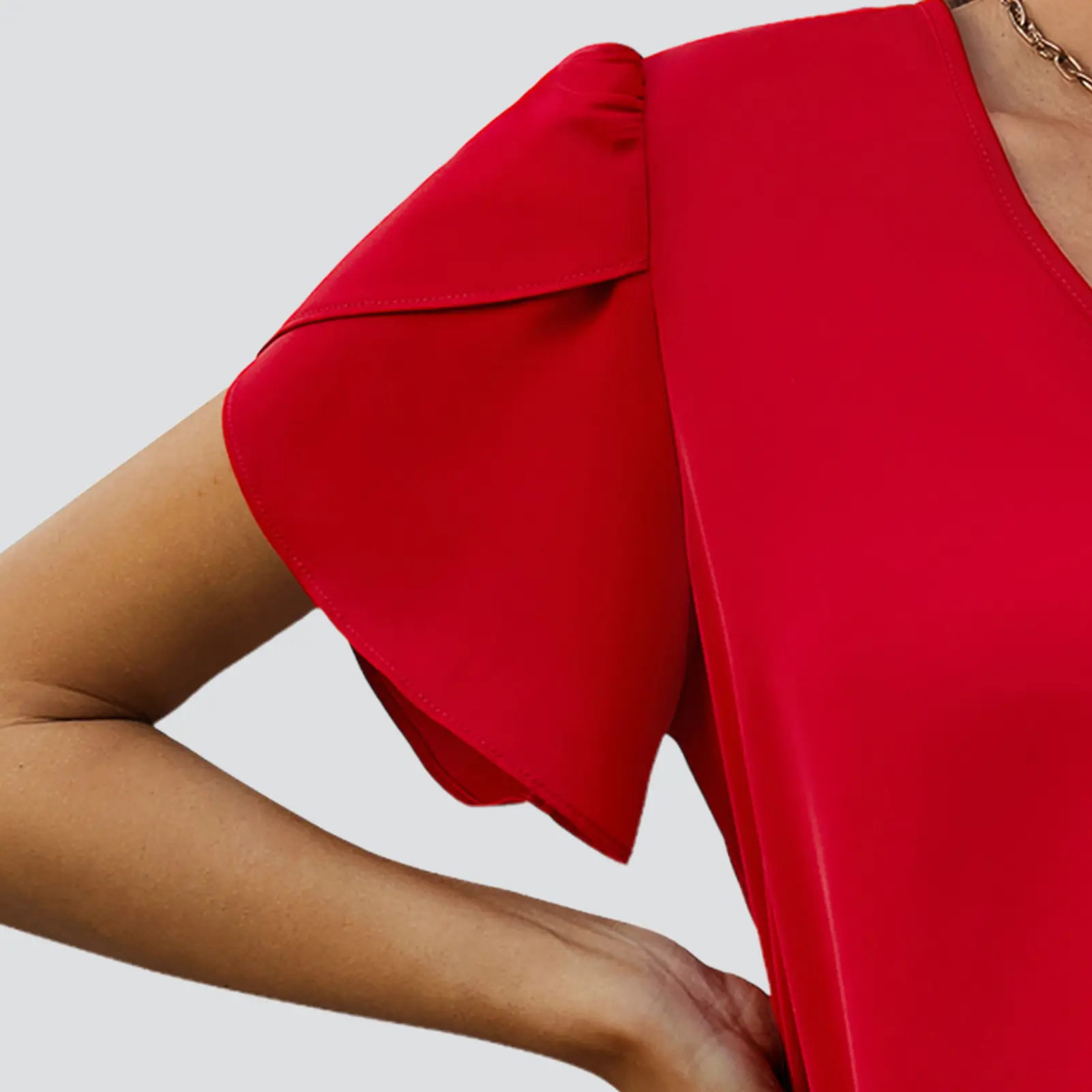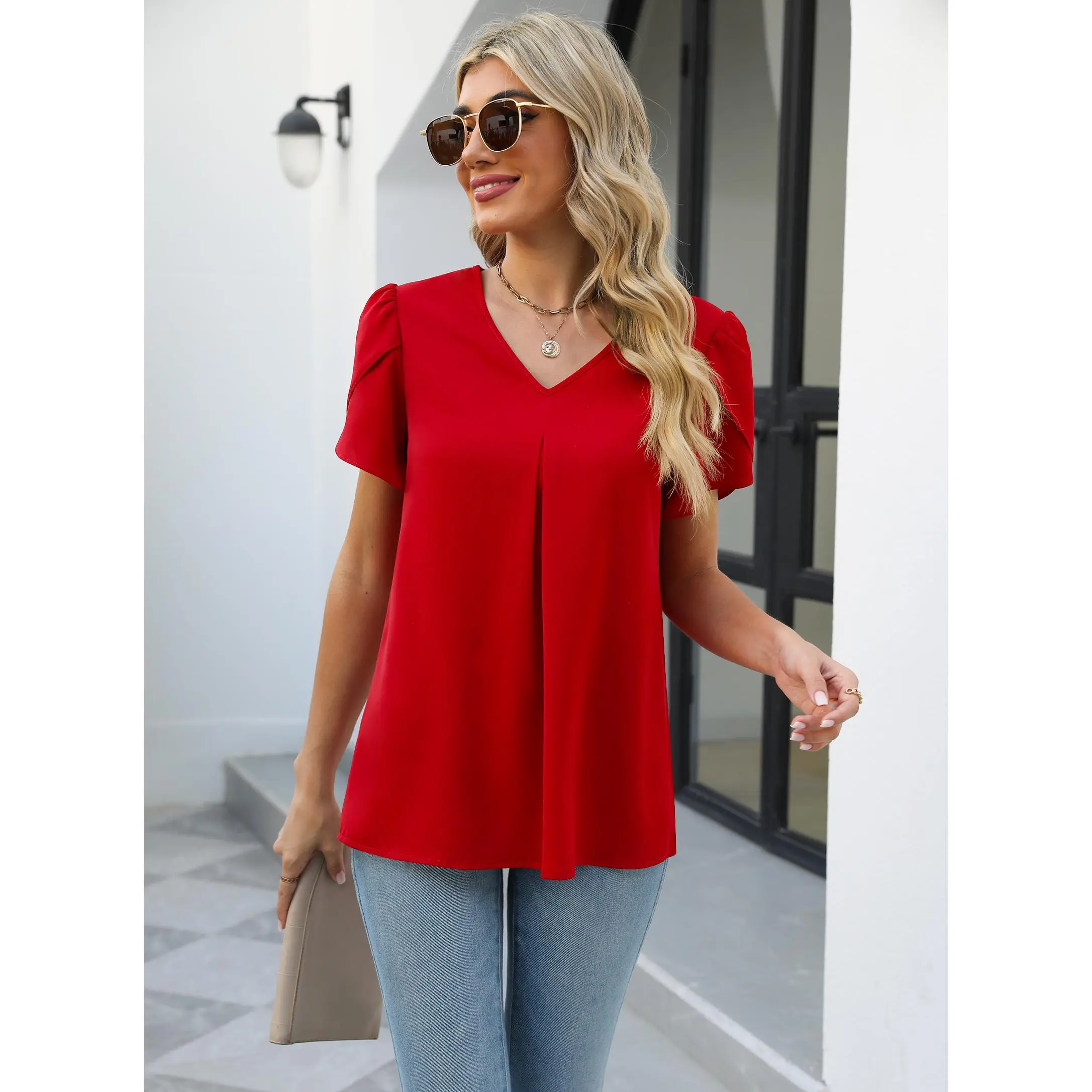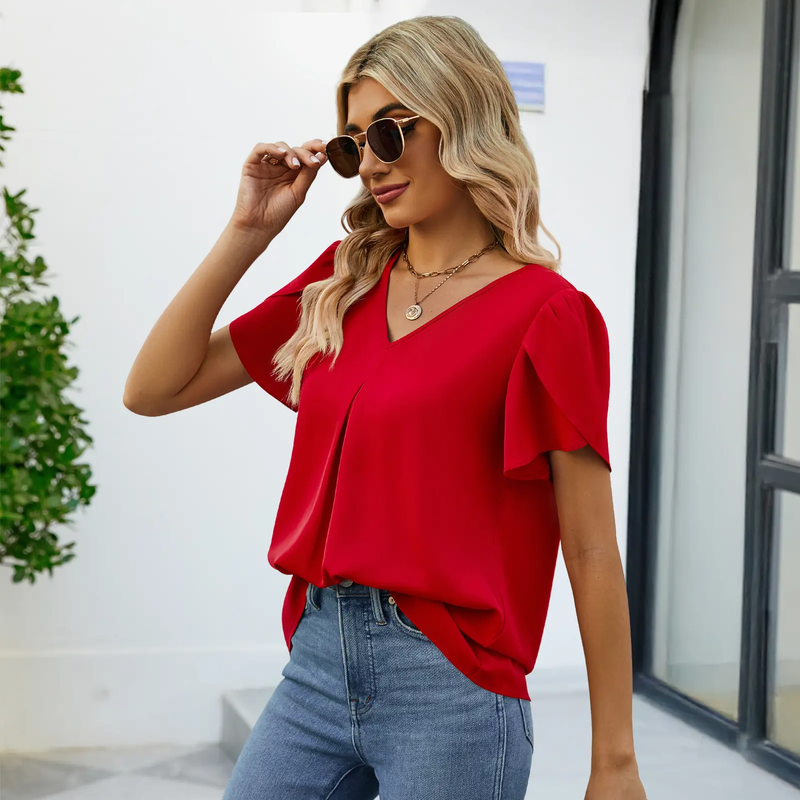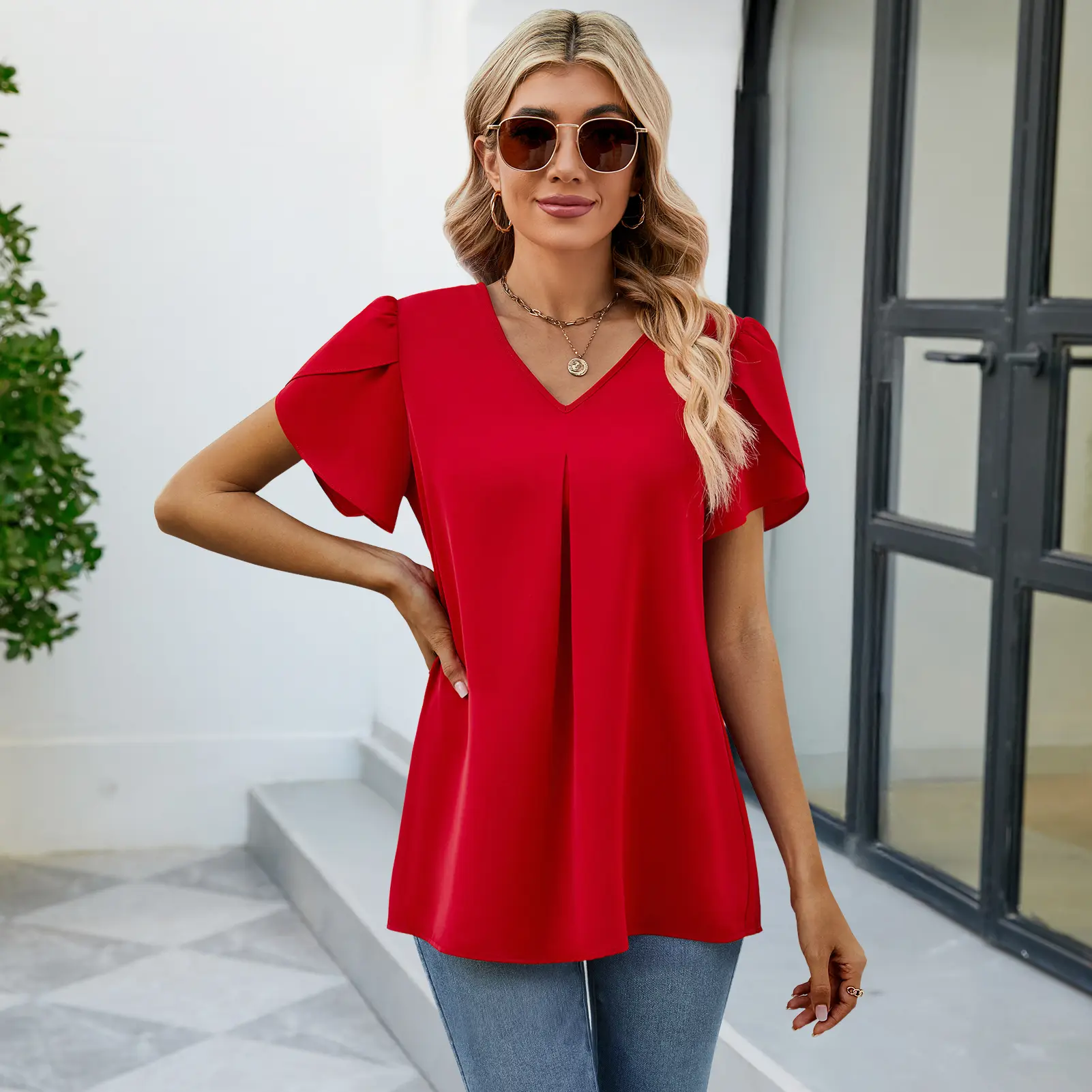 🌸 Dressy chiffon blouse with a V-neck and tulip petal sleeves. Pleated stitched a-line design in the front and back. Loose-fitting to hide tummy, making you look slimmer and trendy. 🌸