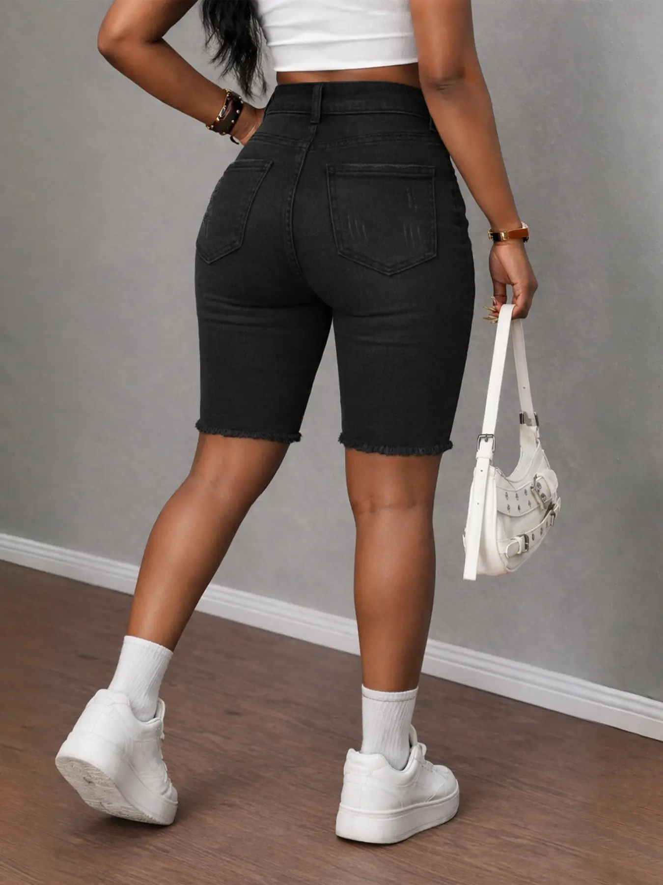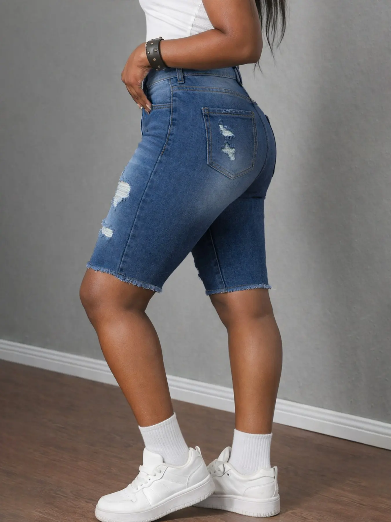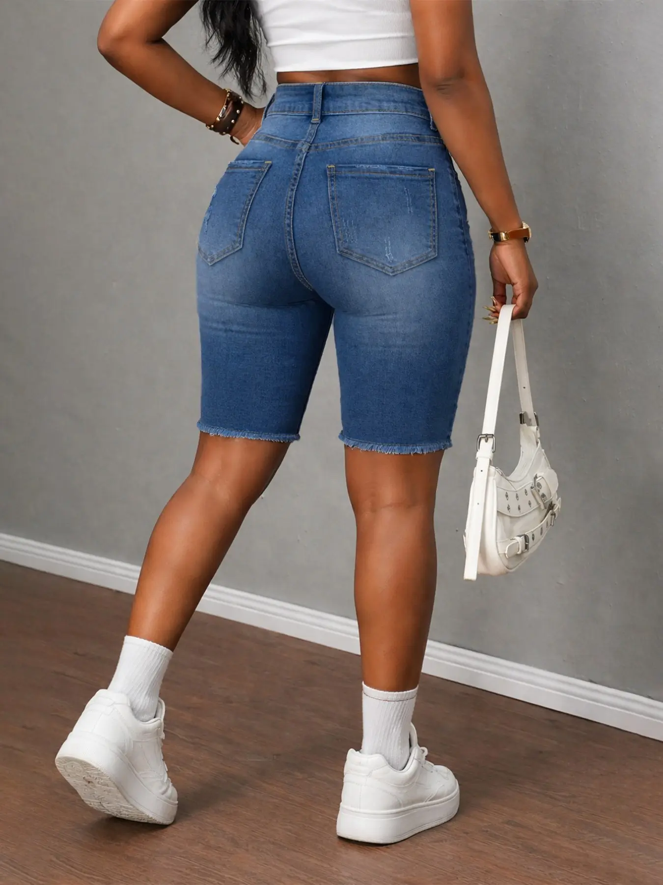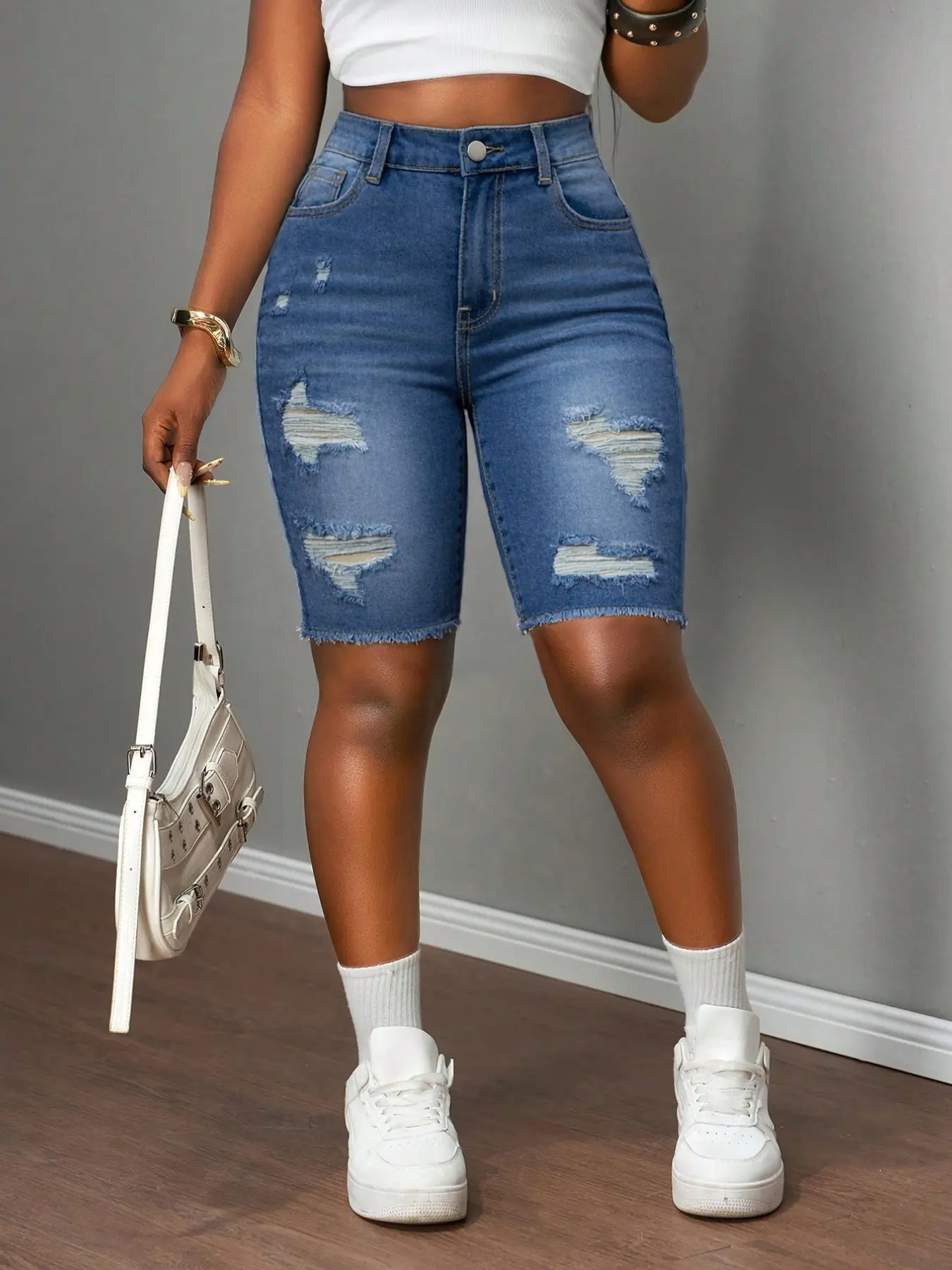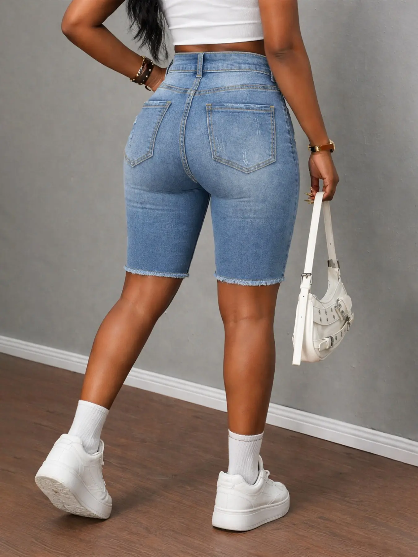 Women's Summer Denim Jeans High Elasticity Mid-Waist Slim Fit Pants, Washed Blue Ripped Design, Casual Style #summer #denimshorts
