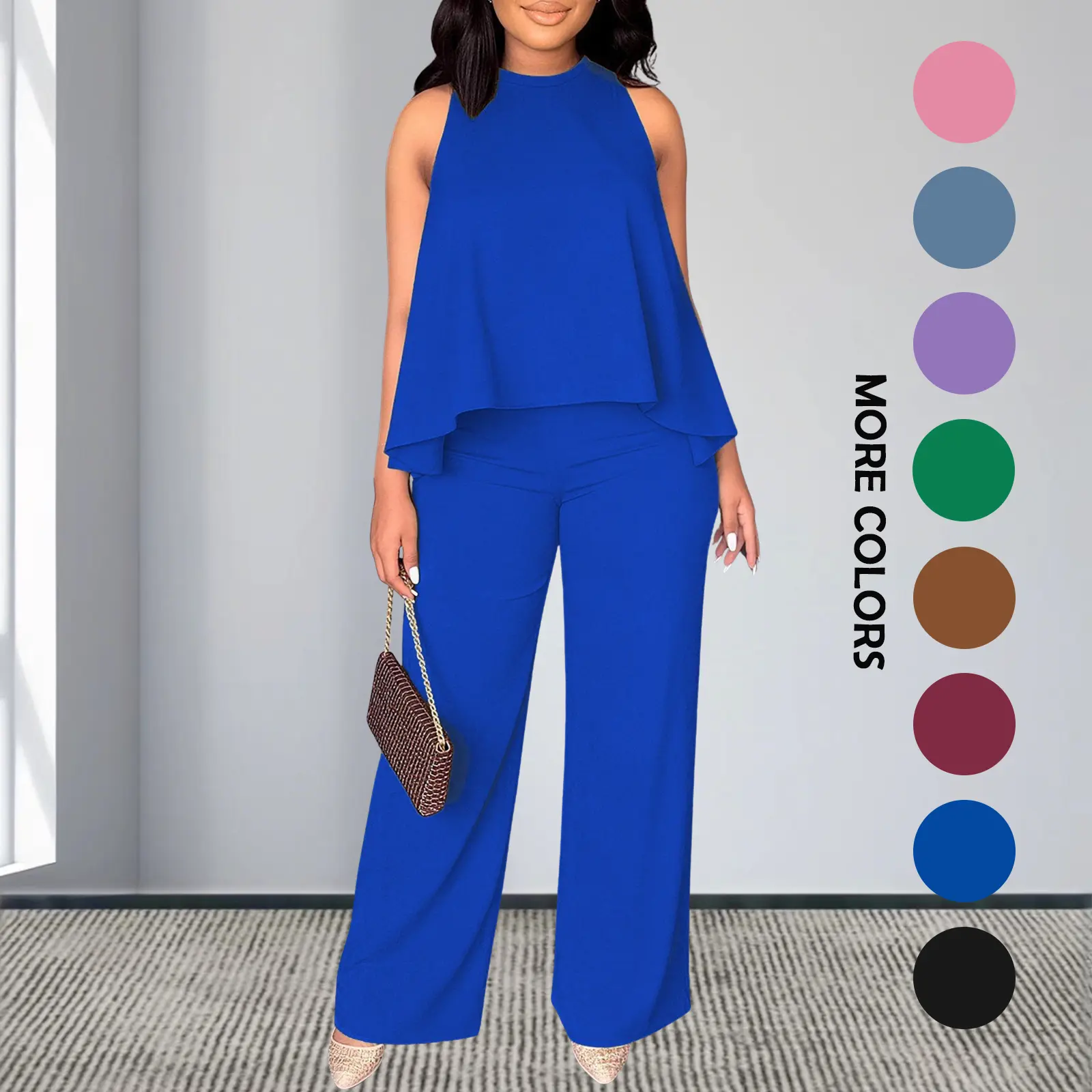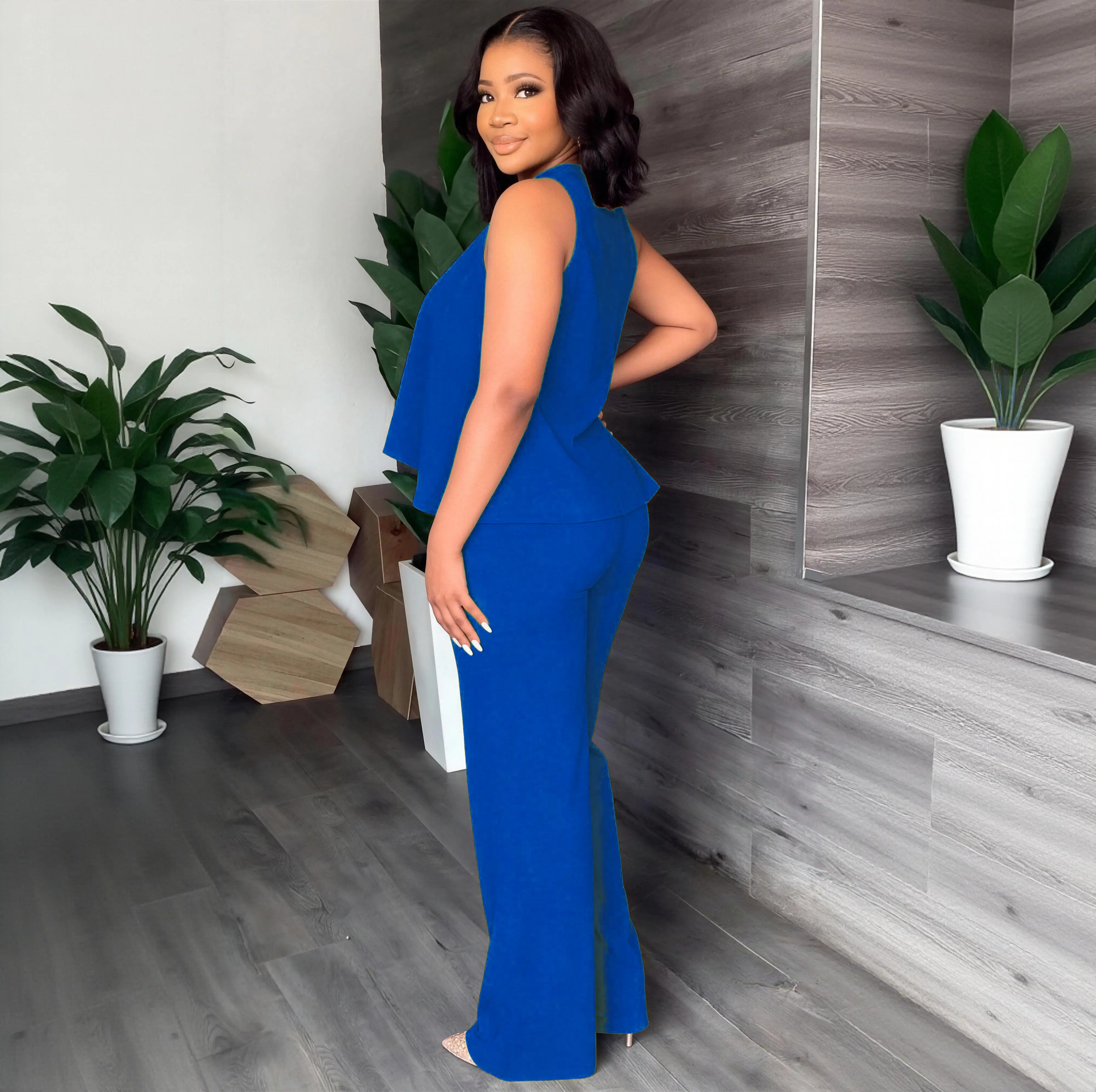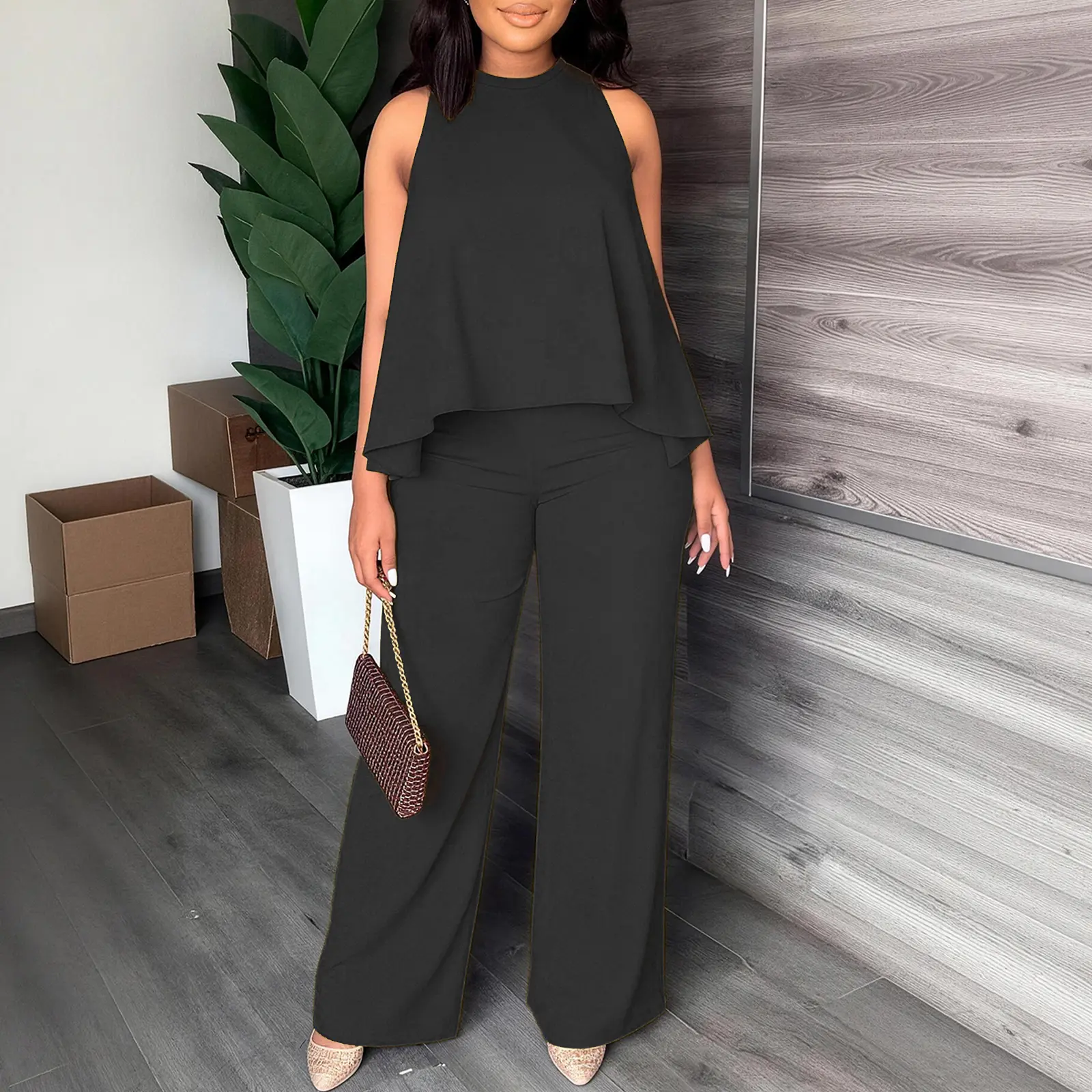 Effortless chic one-and-done outfit! This matching set features a flattering sleeveless cape top and high-waisted wide leg pants, designed to slim your figure and elevate your everyday style with zero effort. A must-have for your casual and dressy wardrobe!