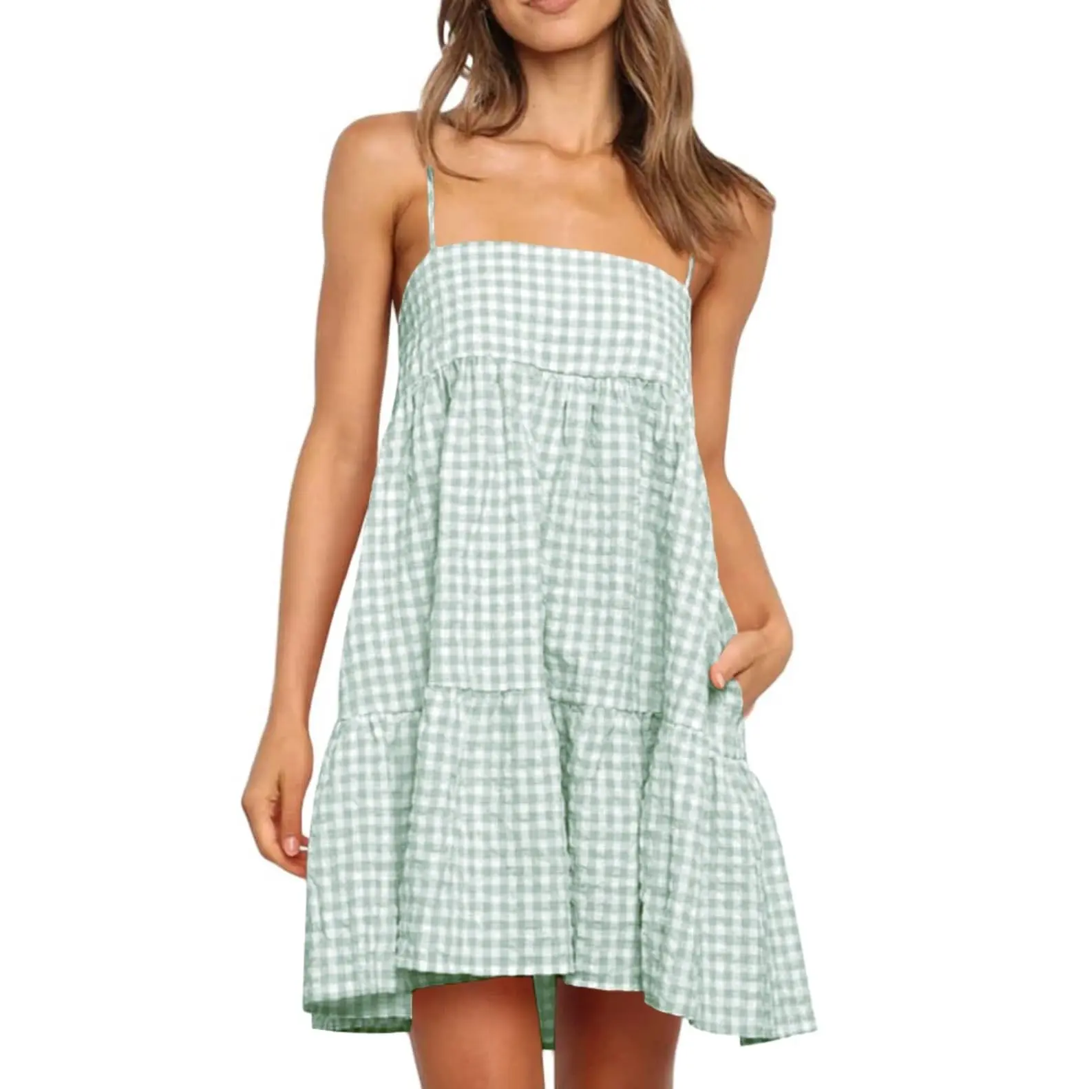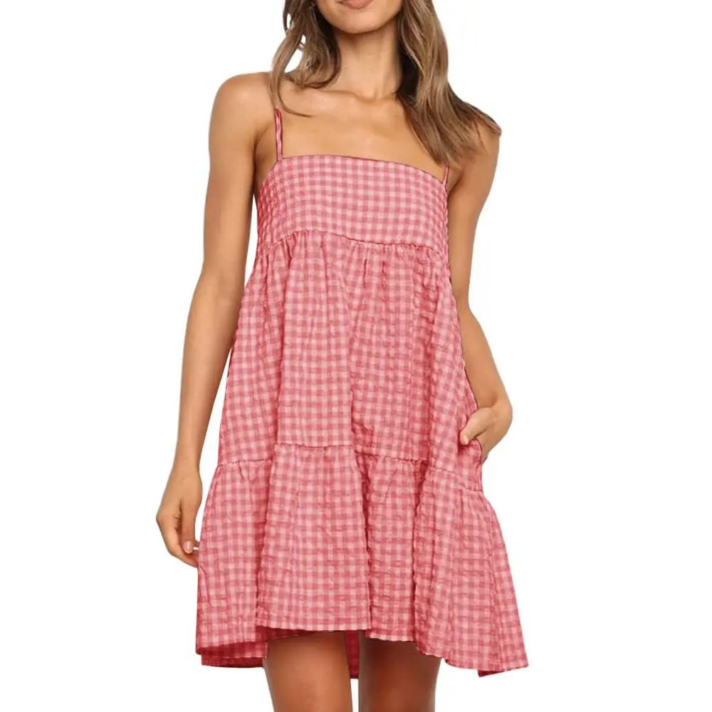 Dress Chic Design: Showcasing a timeless plaid pattern, this sundress boasts a sleeveless design that exudes a laid-back charm. A standout feature includes the convenient side pockets, providing a functional twist to a classic design. Its adjustable spaghetti straps enhancing the overall wearability and comfort of the dress.