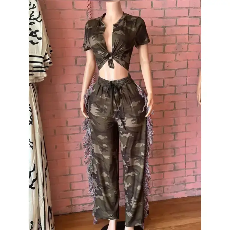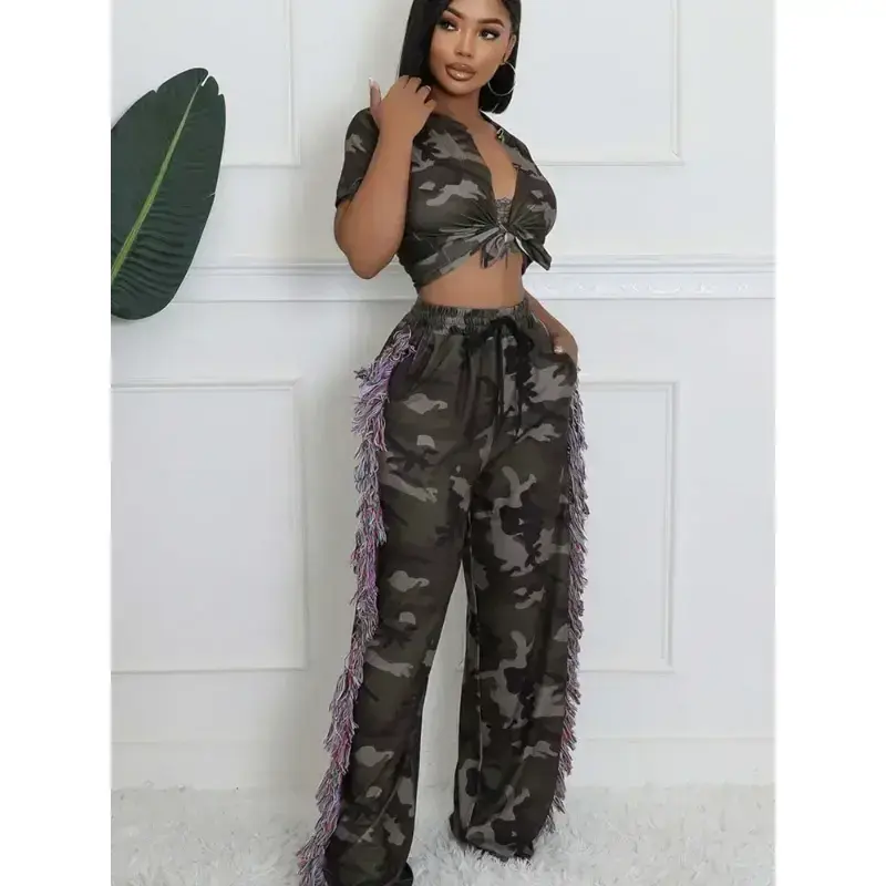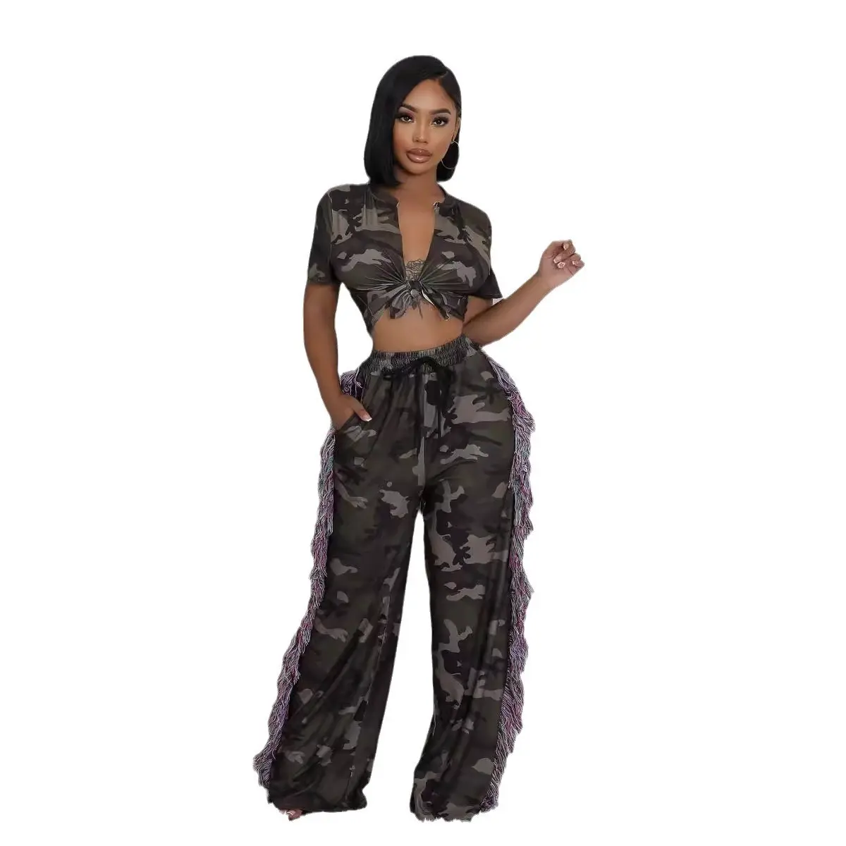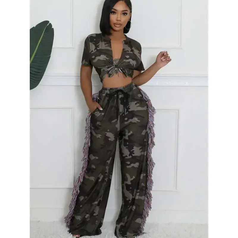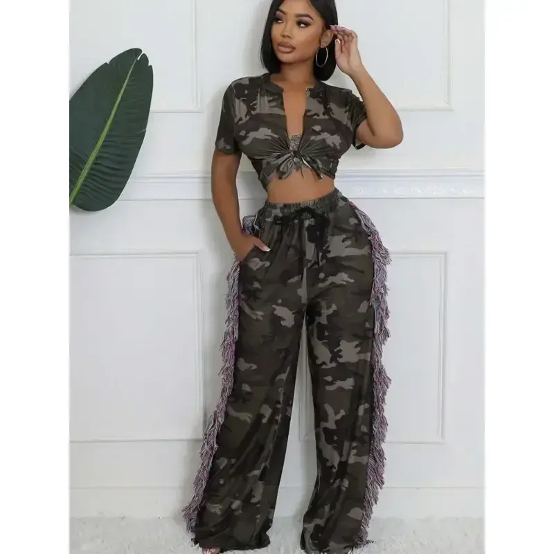 summer spring clothes Camouflage Printed Two Piece Set Women Outfit 2025 new Crop Top and Side Tassel Wide Leg Pants Matching Sets Y2K Womenswear Check Light Suits Gamis Trouser Army Green Short Shortsleeve