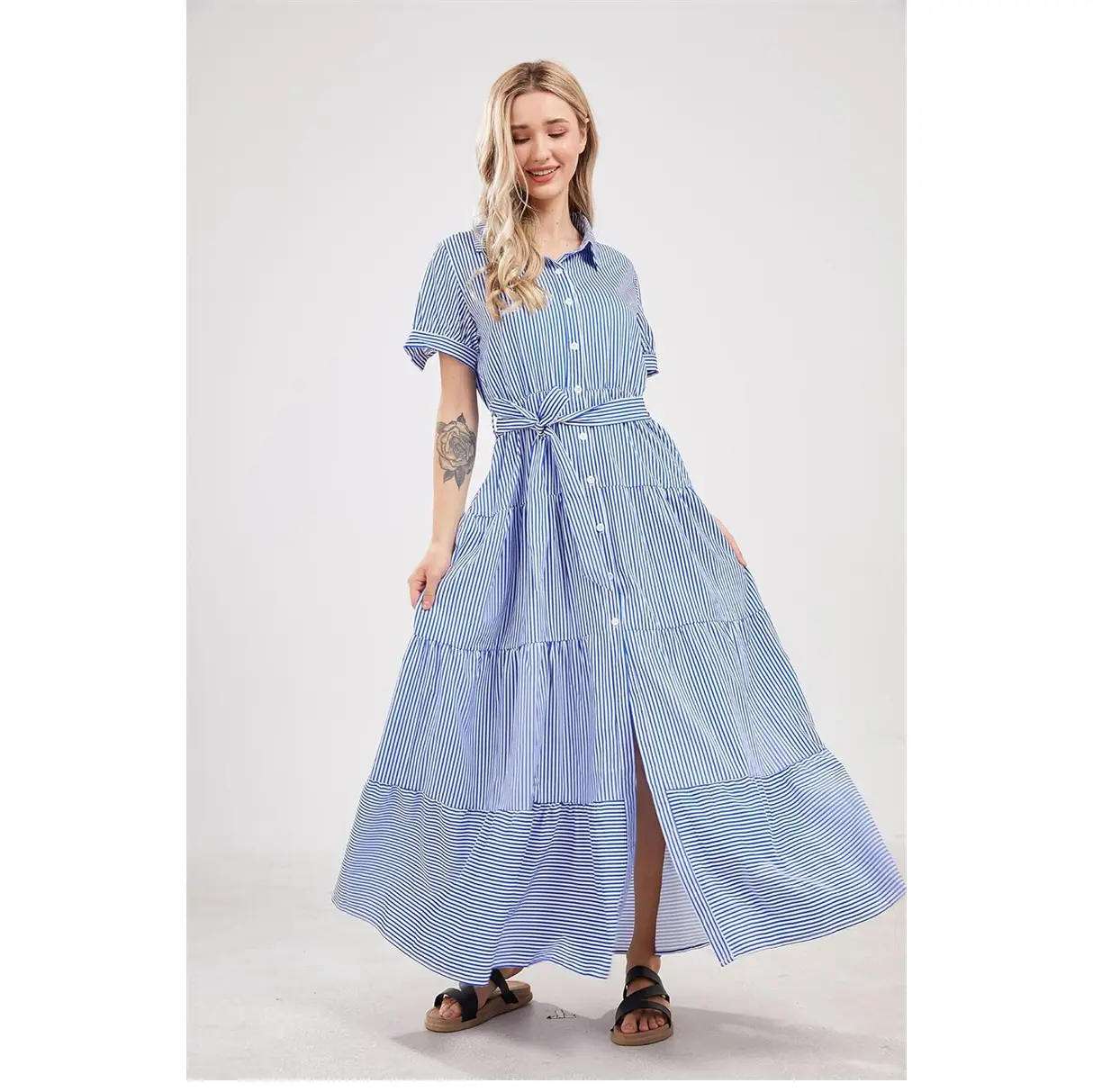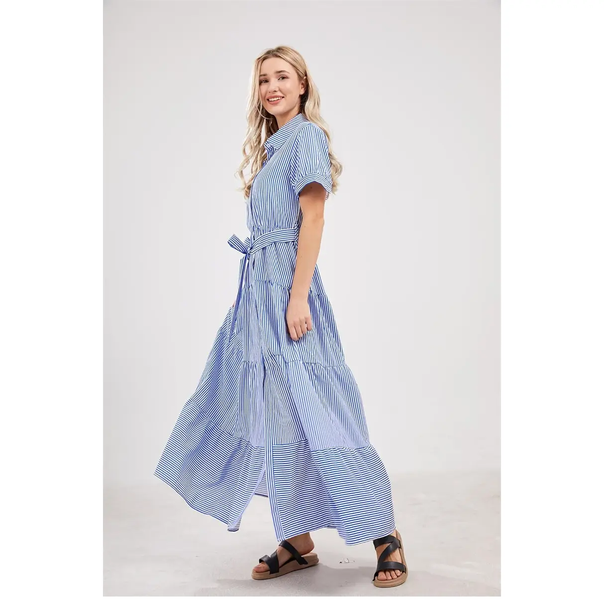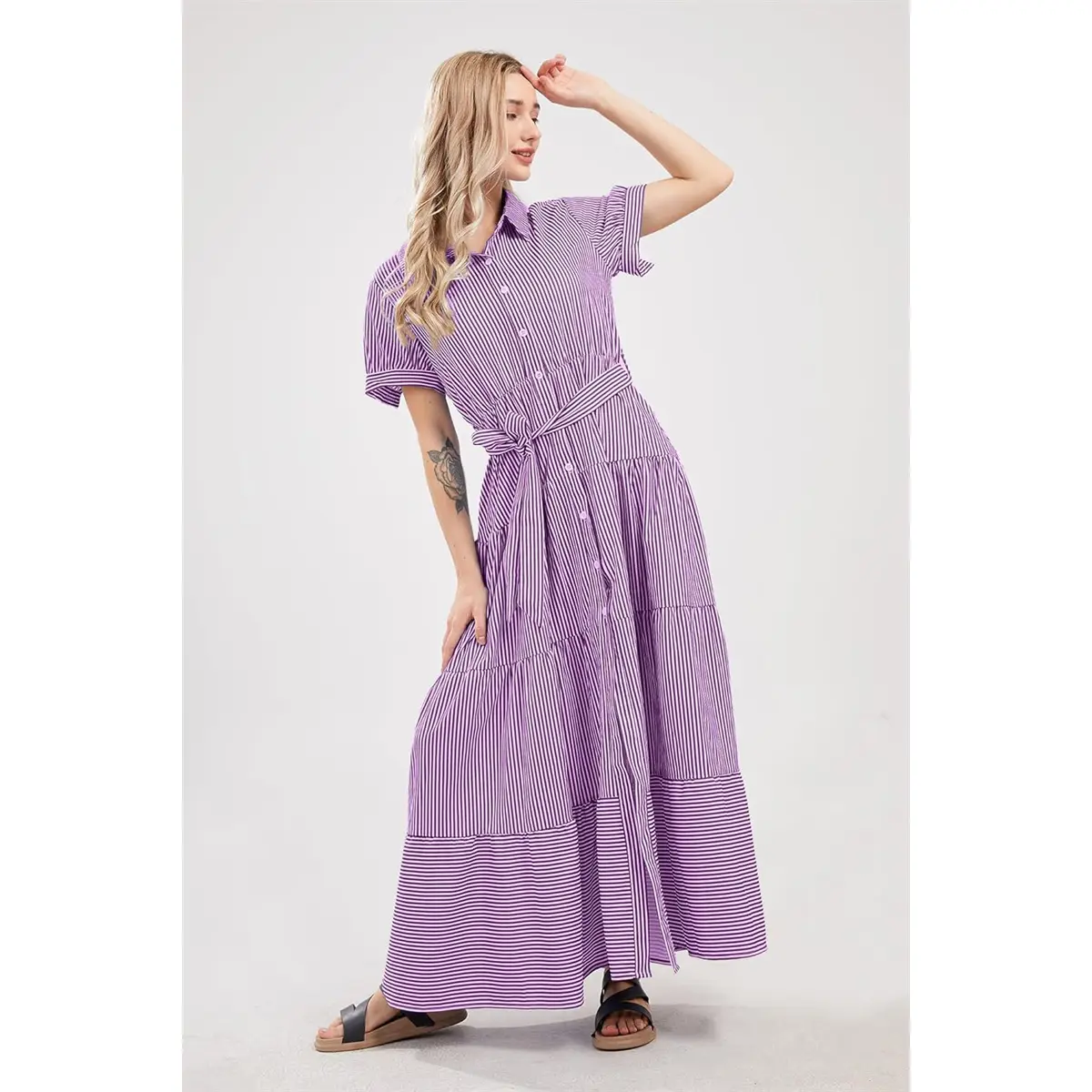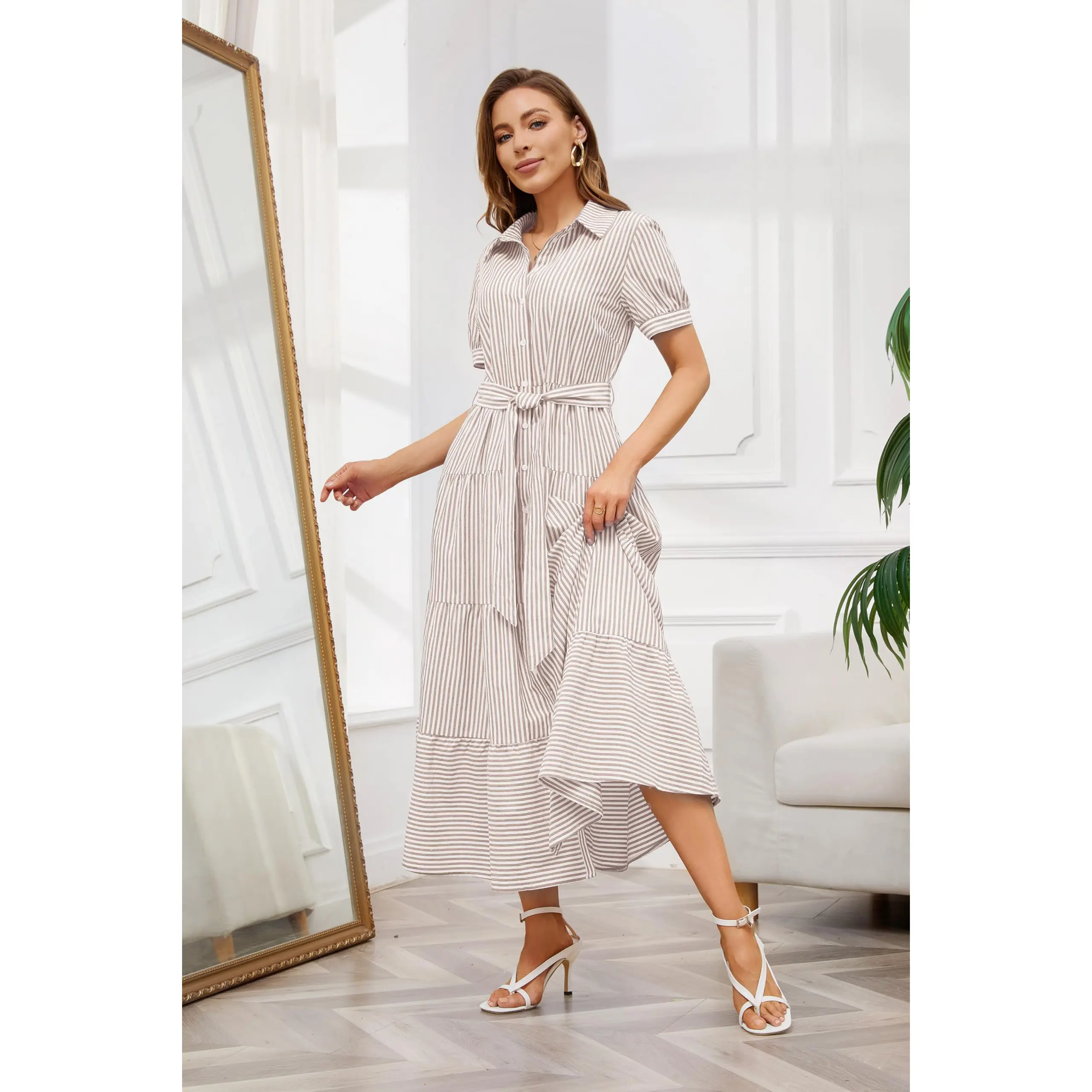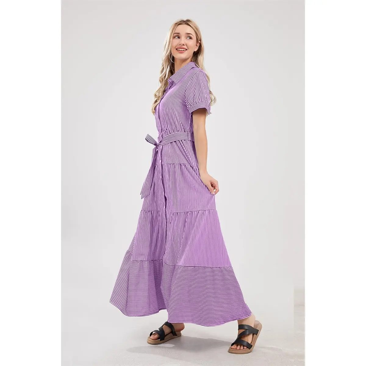 ·This 2025 fashion striped button-down maxi dress features a belt, polo collar, short sleeves, high waist, button closure, slimming fit, a-line silhouette, layered ruffled hemline, and contrast colored stripes. It's perfect for keeping charming all the time.