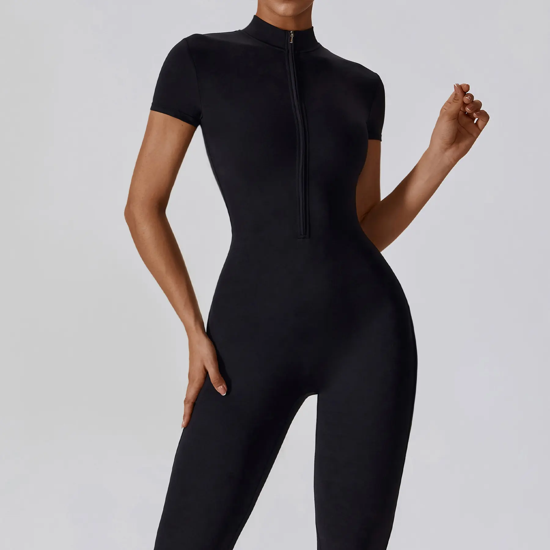 Women's summer zip-up, skin-feel short-sleeve bodysuit, breathable and skin-friendly with a slim-fit cut and hip-lifting design, ideal for yoga, Pilates, and fitnessWomen's summer zip-up, skin-feel short-sleeve bodysuit, breathable and skin-friendly with a slim-fit cut and hip-lifting design, ideal for yoga, Pilates, and fitness