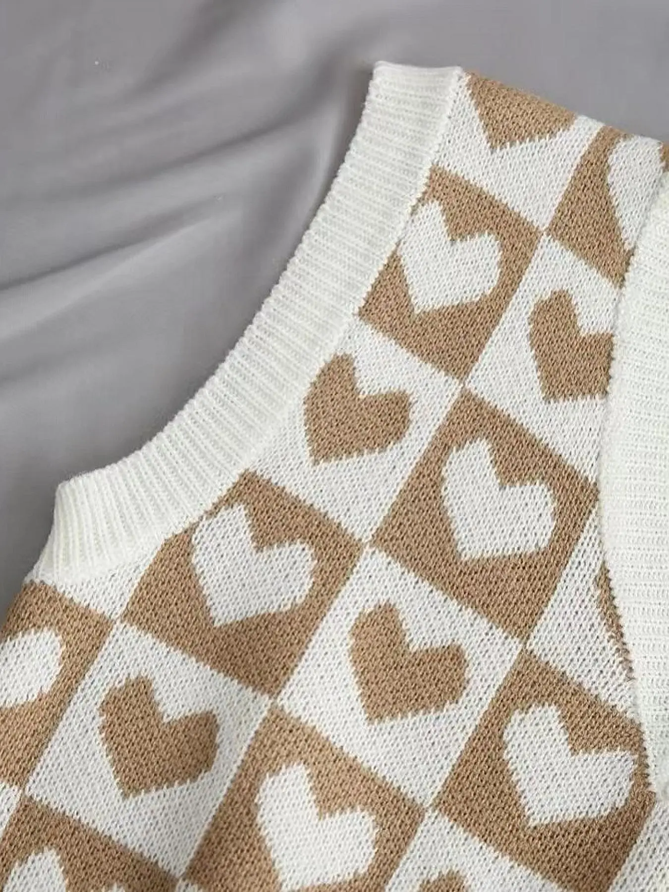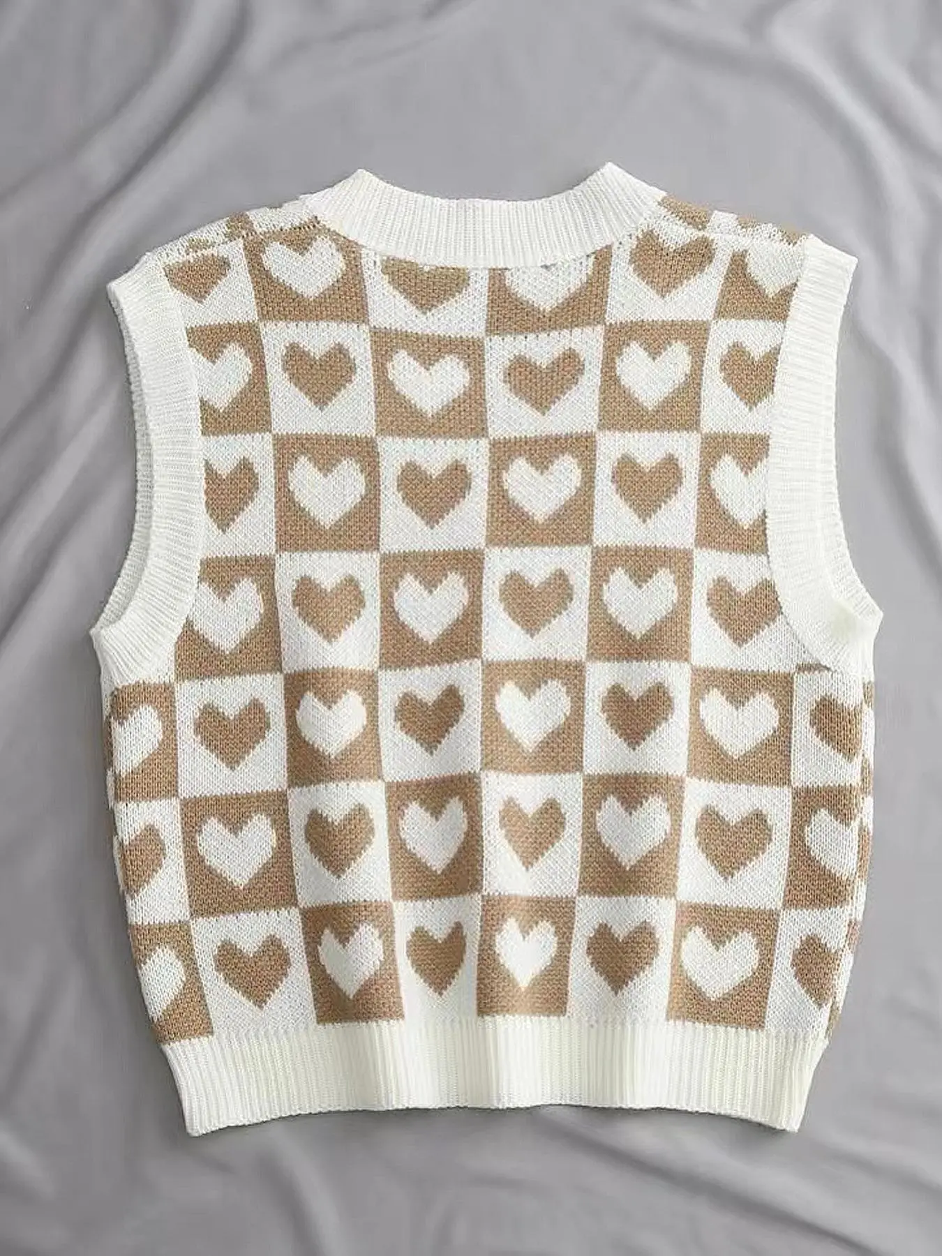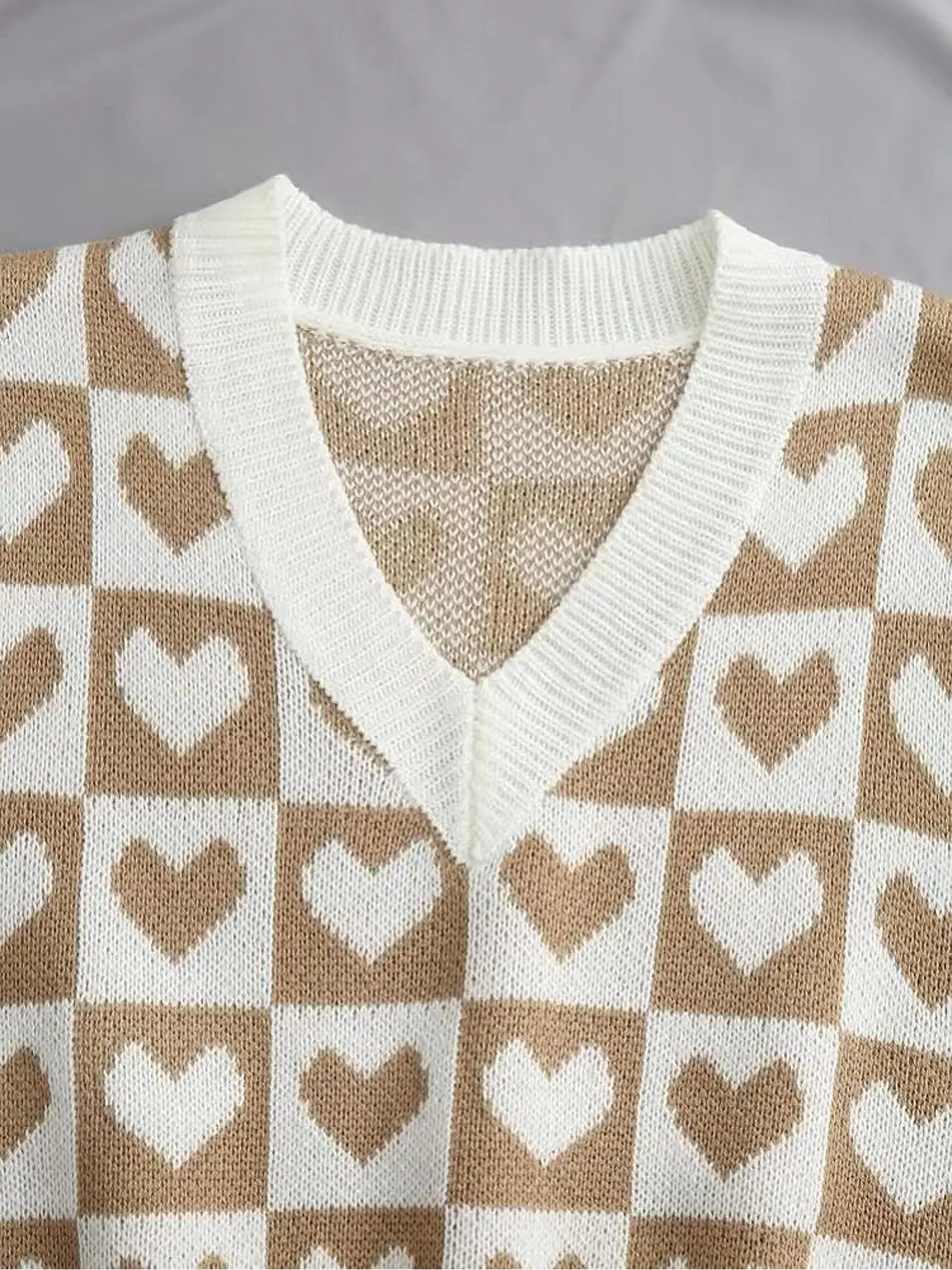 Women's Heart & Plaid Print V Neck Sweater Vest, Casual Sleeveless Knit Top for Daily Wear, Ladies Knitwear for All Seasons, Casual Comfy Vests