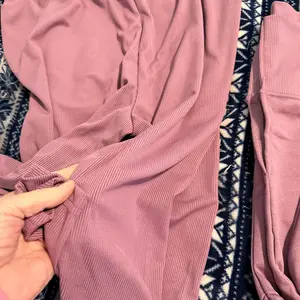 The leggings are ribbed and a SUPER thin material. The waist band is also junk and doesn’t stay in place