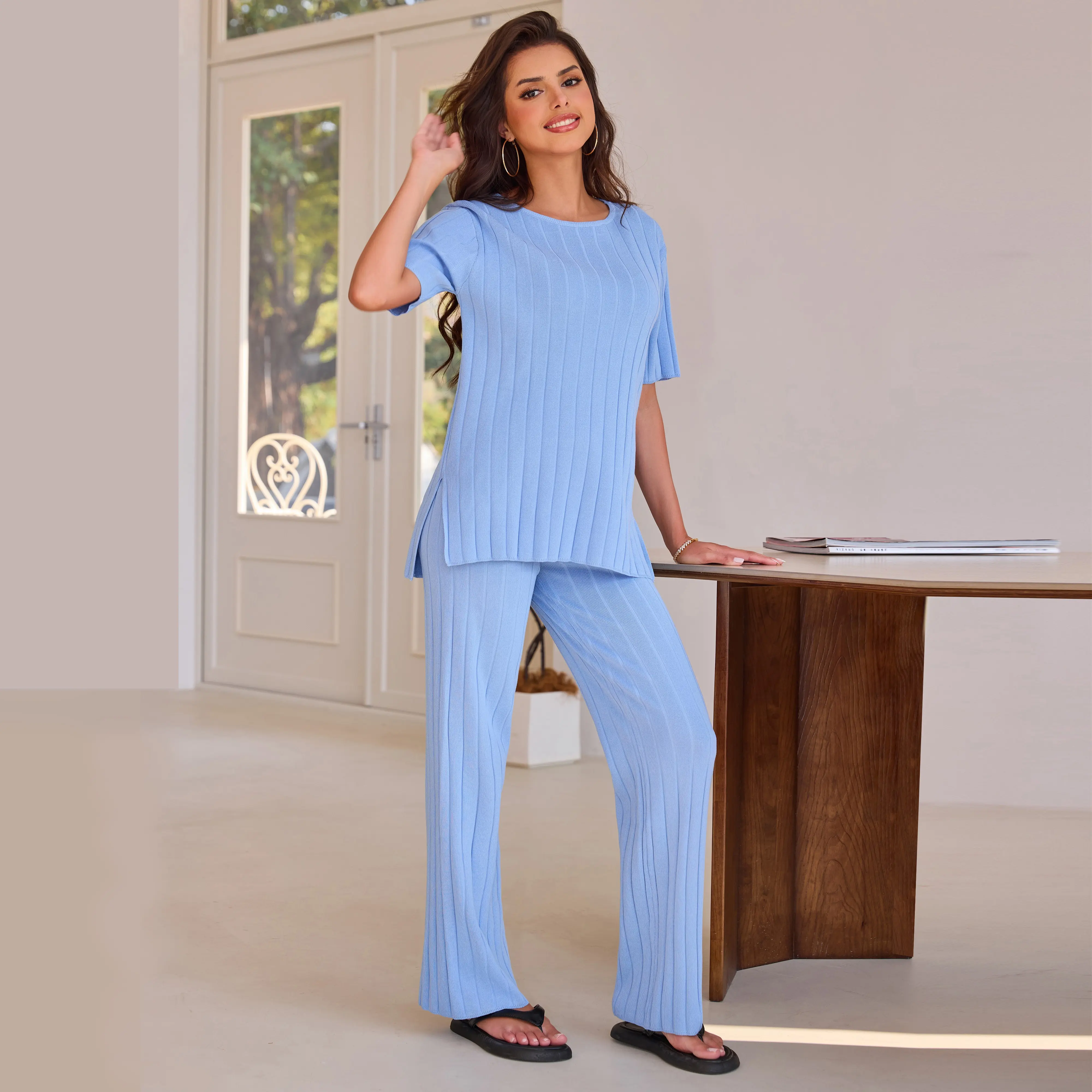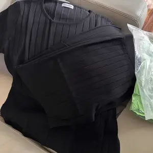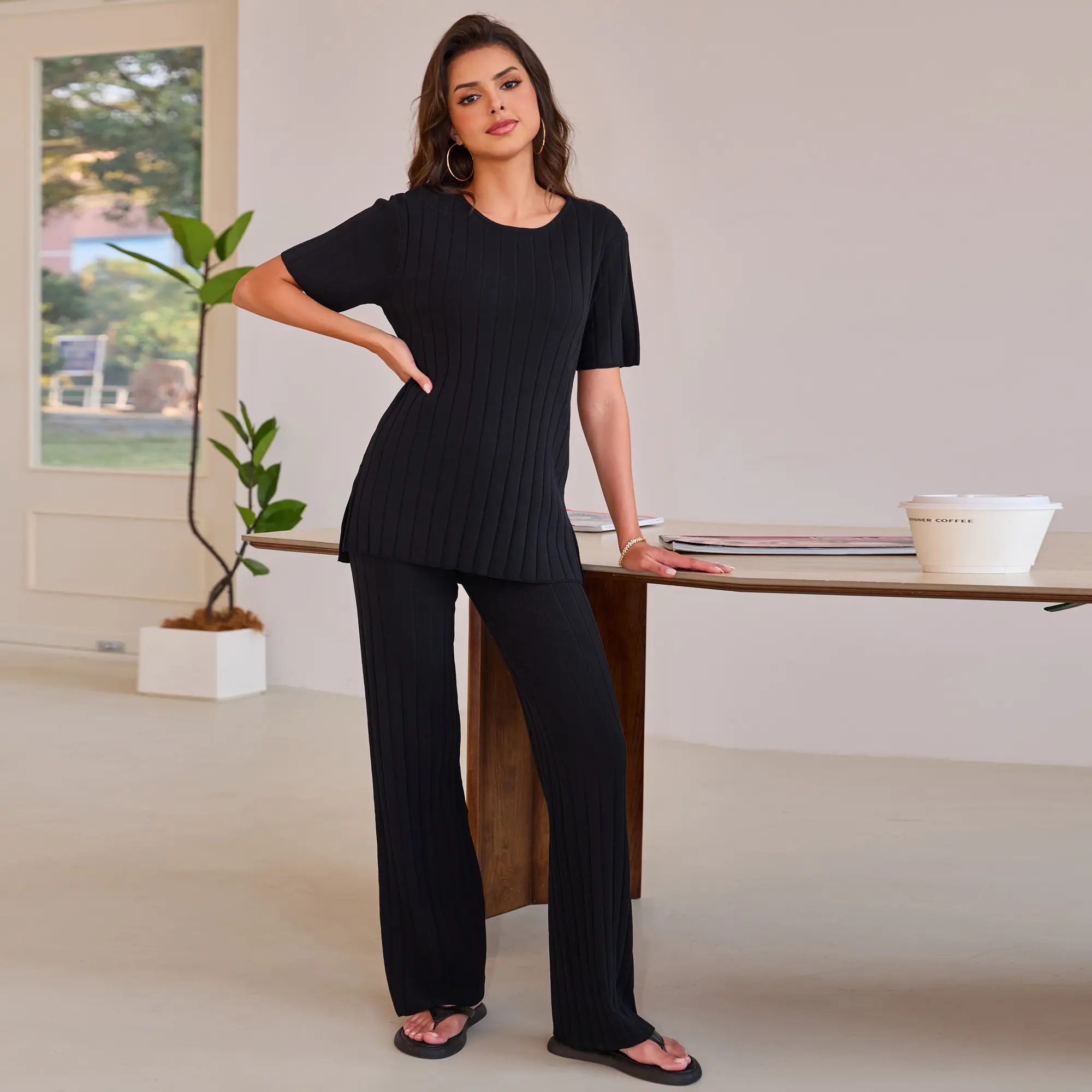 This Women's Black Ribbed Knit Sweater Set is the epitome of comfort and style. It features a short - sleeved top and matching wide - leg pants, both crafted with a ribbed knit texture that offers a flattering fit and a touch of elegance. The sleek black color makes it a versatile addition to your wardrobe, suitable for various occasions.