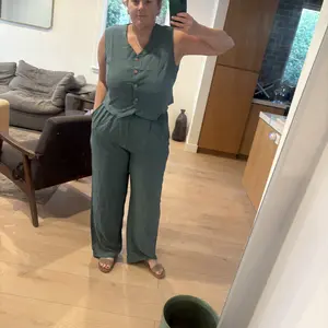 Love this! I’m 5’6, 190 lbs. Fabric is so light. It looks great and I’m excited to wear it on my trip! Also big plus that it has pockets. Looks like a jumpsuit but it’s 2 piece, so much easier to wear out and about! Definitely recommend this outfit!