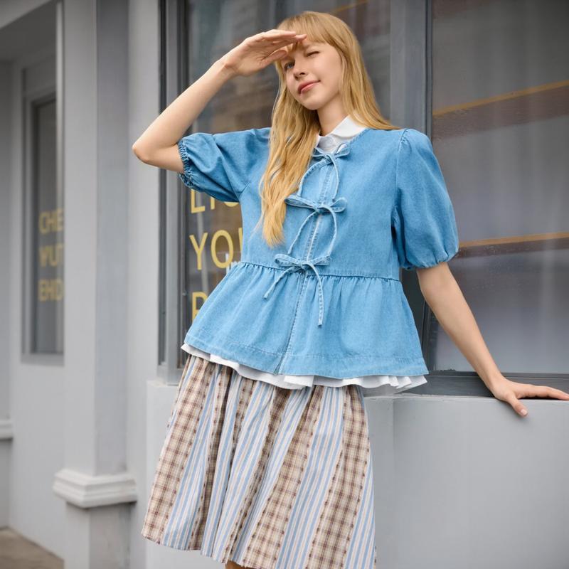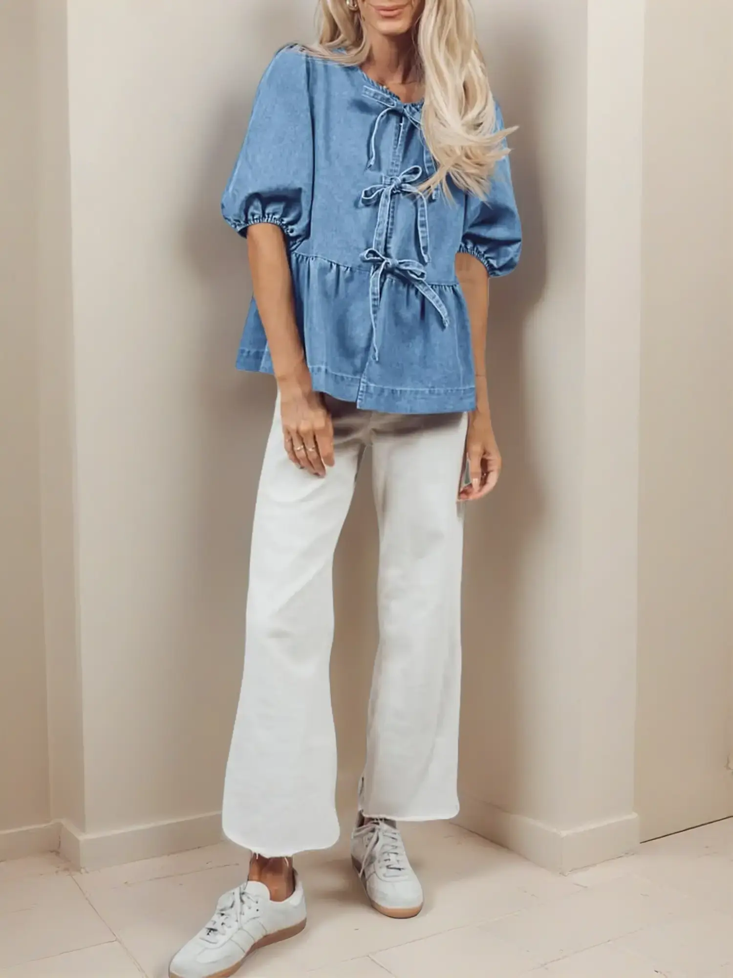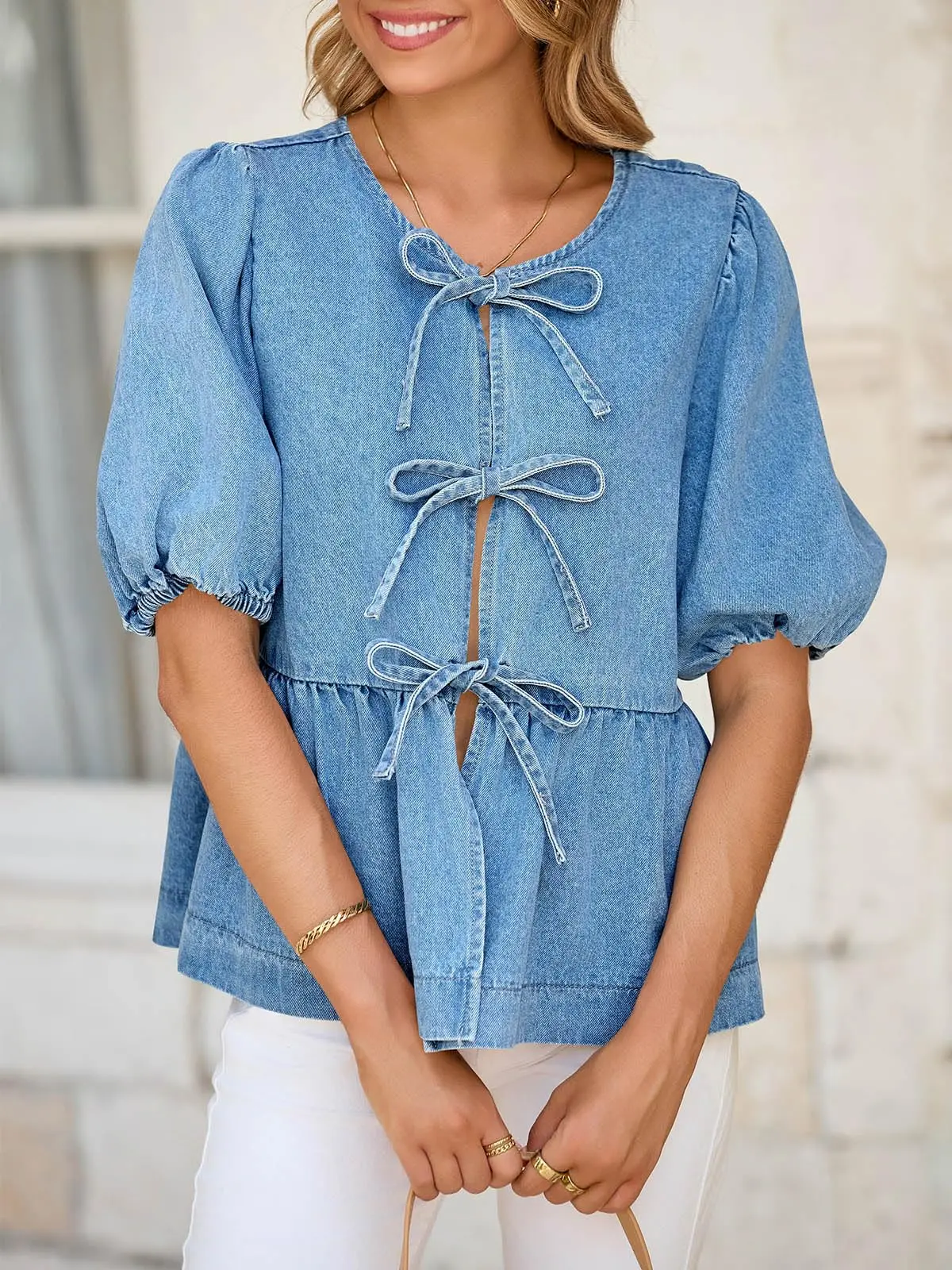 ·Features: These denim shirts feature short puff sleeves, crew neck, bow tie front, casual loose fit, solid color, peplum babydoll blouses.