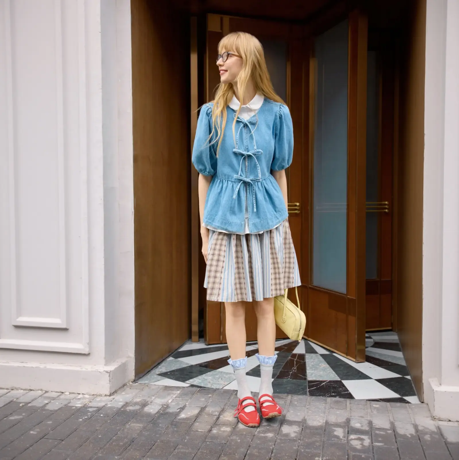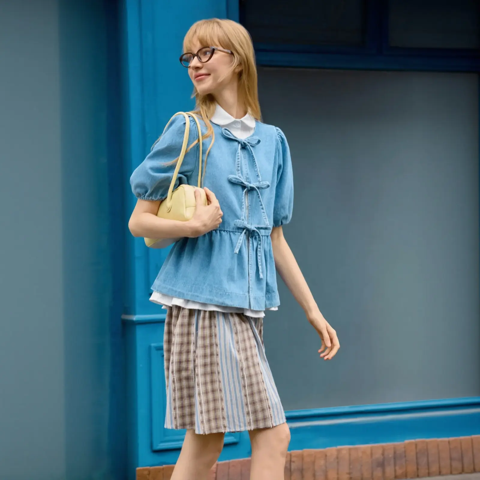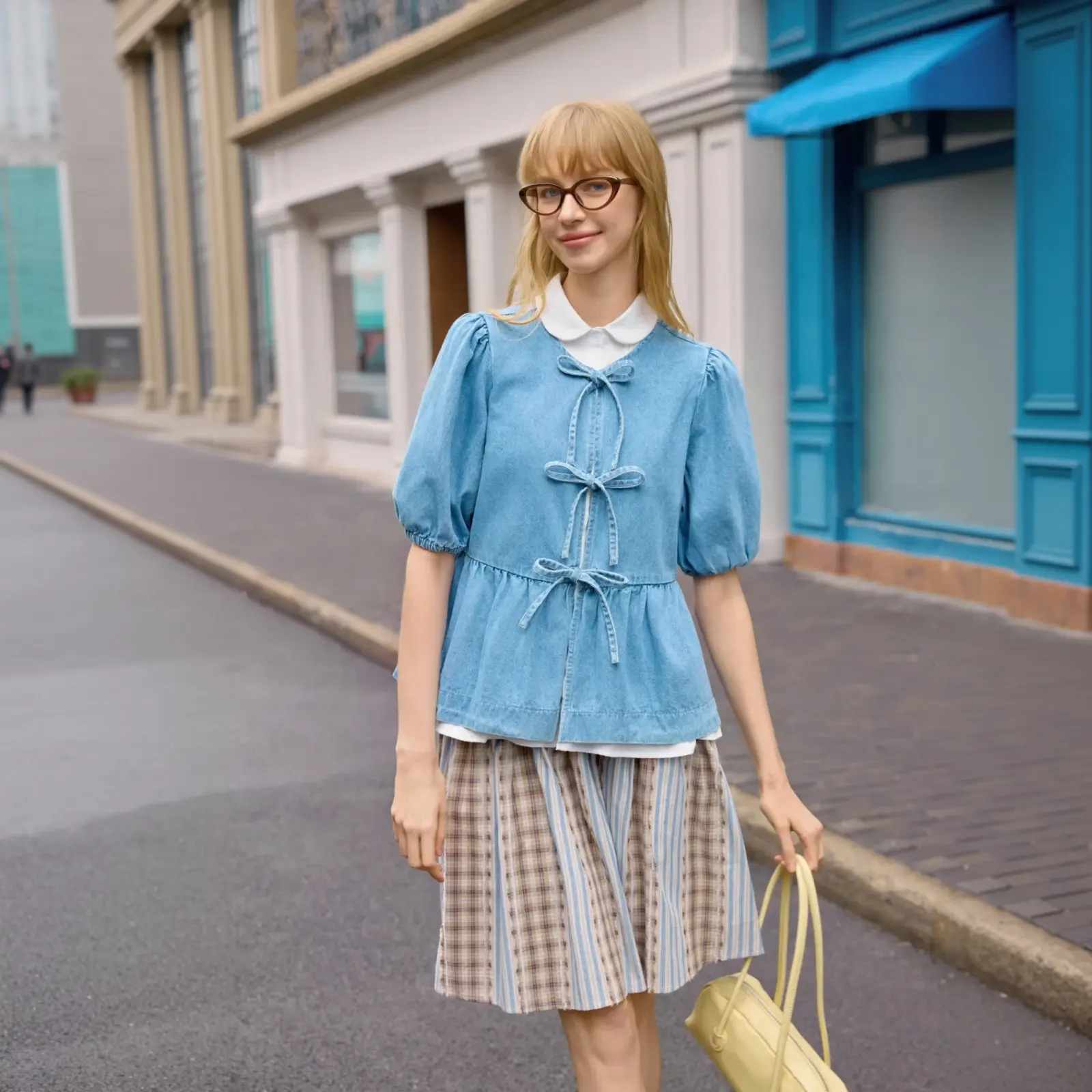 ·Features: These denim shirts feature short puff sleeves, crew neck, bow tie front, casual loose fit, solid color, peplum babydoll blouses.