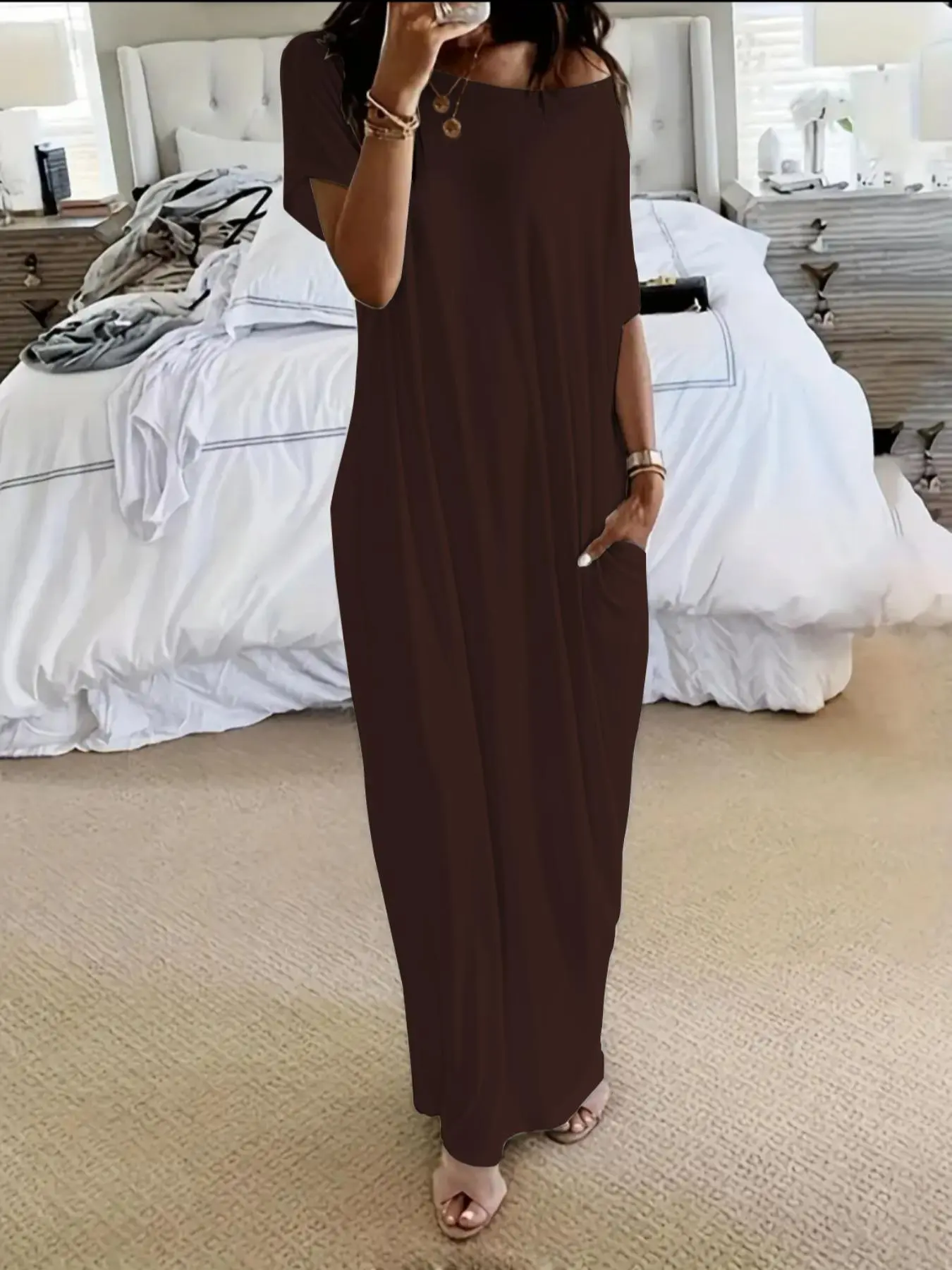 Nice for lounging around the house. Color matches the picture. It stops at the top of your feet which is good. Comfortable.