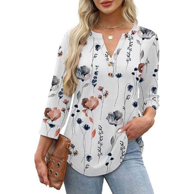 This shirt has Such nice material .i Very comfortable and sizing in Right On the mark. The sleeves are 3/4 and very comfortable and hide the things you don’t want seen. The colors are so pretty and feminine.