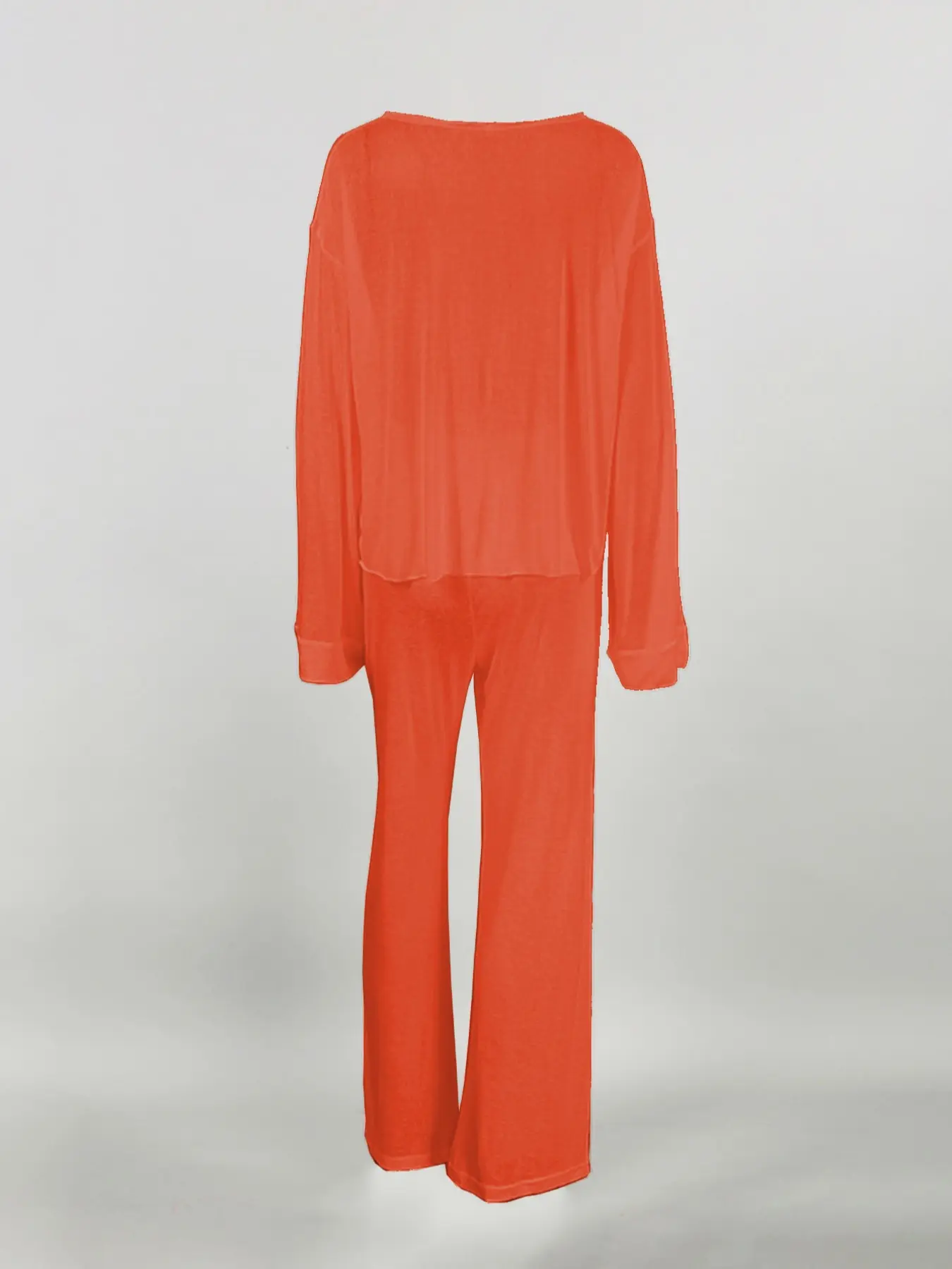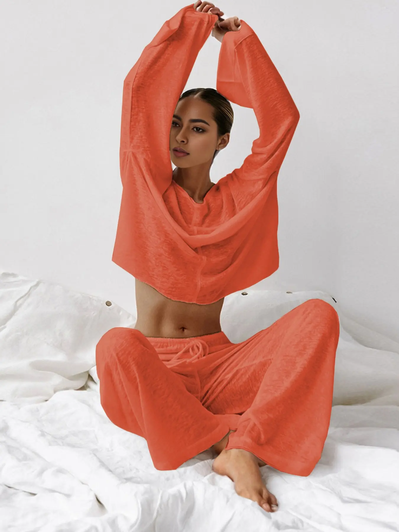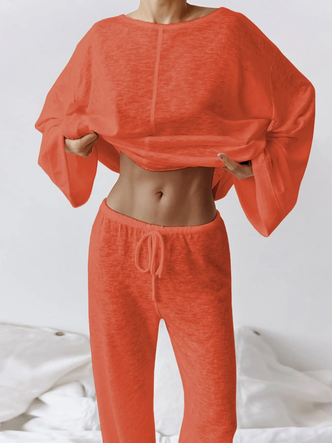5. Women's Micro-Transparent Fabric Round Neck Long Sleeve Pants Loose Fit Comfortable Two-Piece Set, Casual Fashion