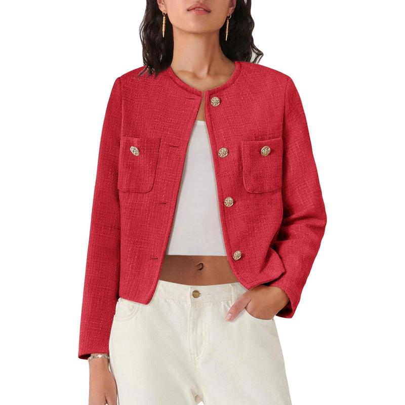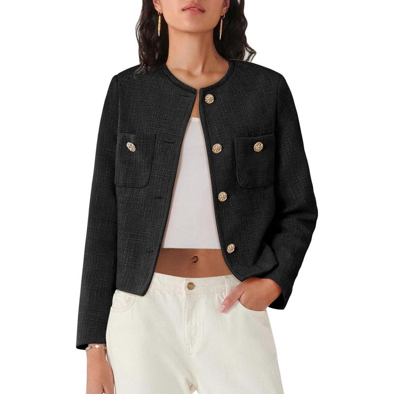 Women's Tweed Jacket Long Sleeve Button Down Casual Cropped Blazer