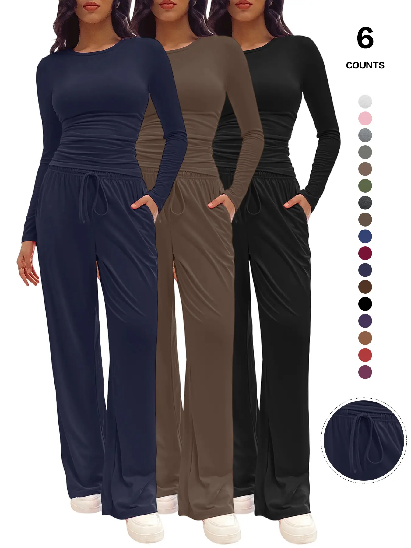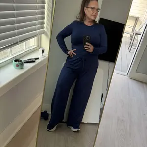 Soft and comfortable with a functioning drawstring. Wear together and/or separately to add versatility to your wardrobe. The pockets are a bonus. The cinched long sleeve top looks great with pants, skirt, shorts, and jeans. I usually wear a medium and ordered a large. 5’6 150 lbs 36 D