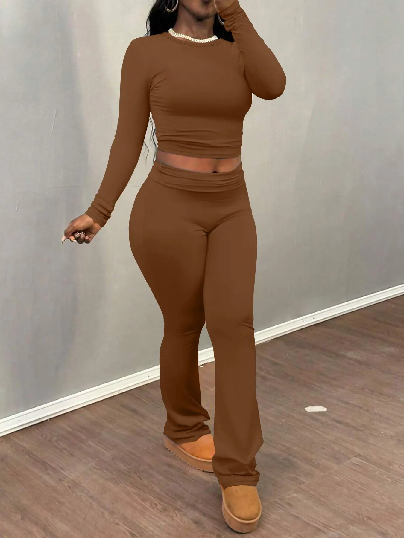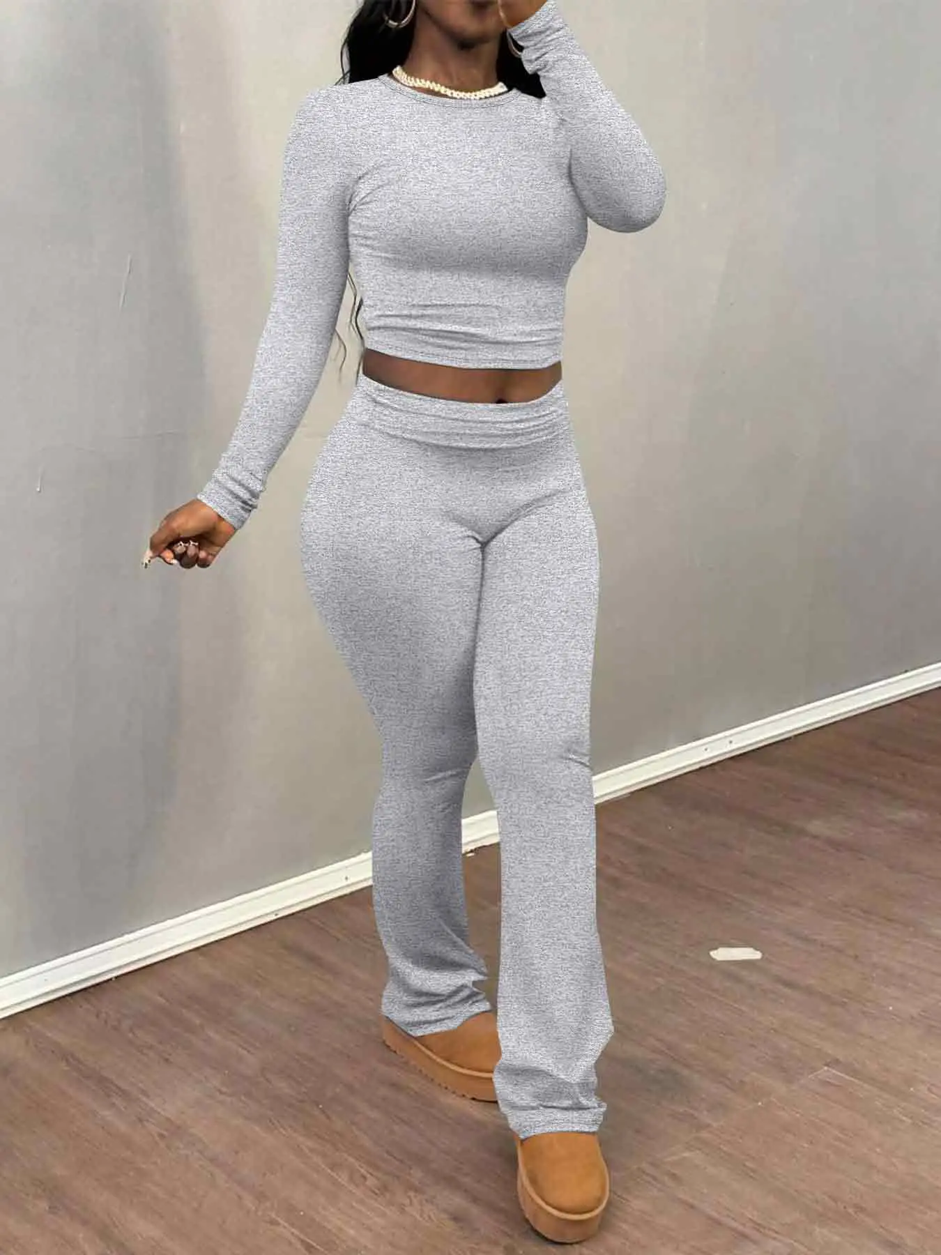 5. Women's Solid Long Sleeve Crop Top & Flare Leg Pants Two-piece Set, Casual Fashion Cozy Basic Round Neck Top & Bell Bottom Trousers for Daily Outdoor Wear, Women's Clothing for Fall & Winter