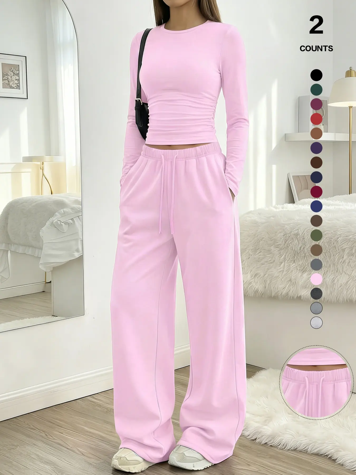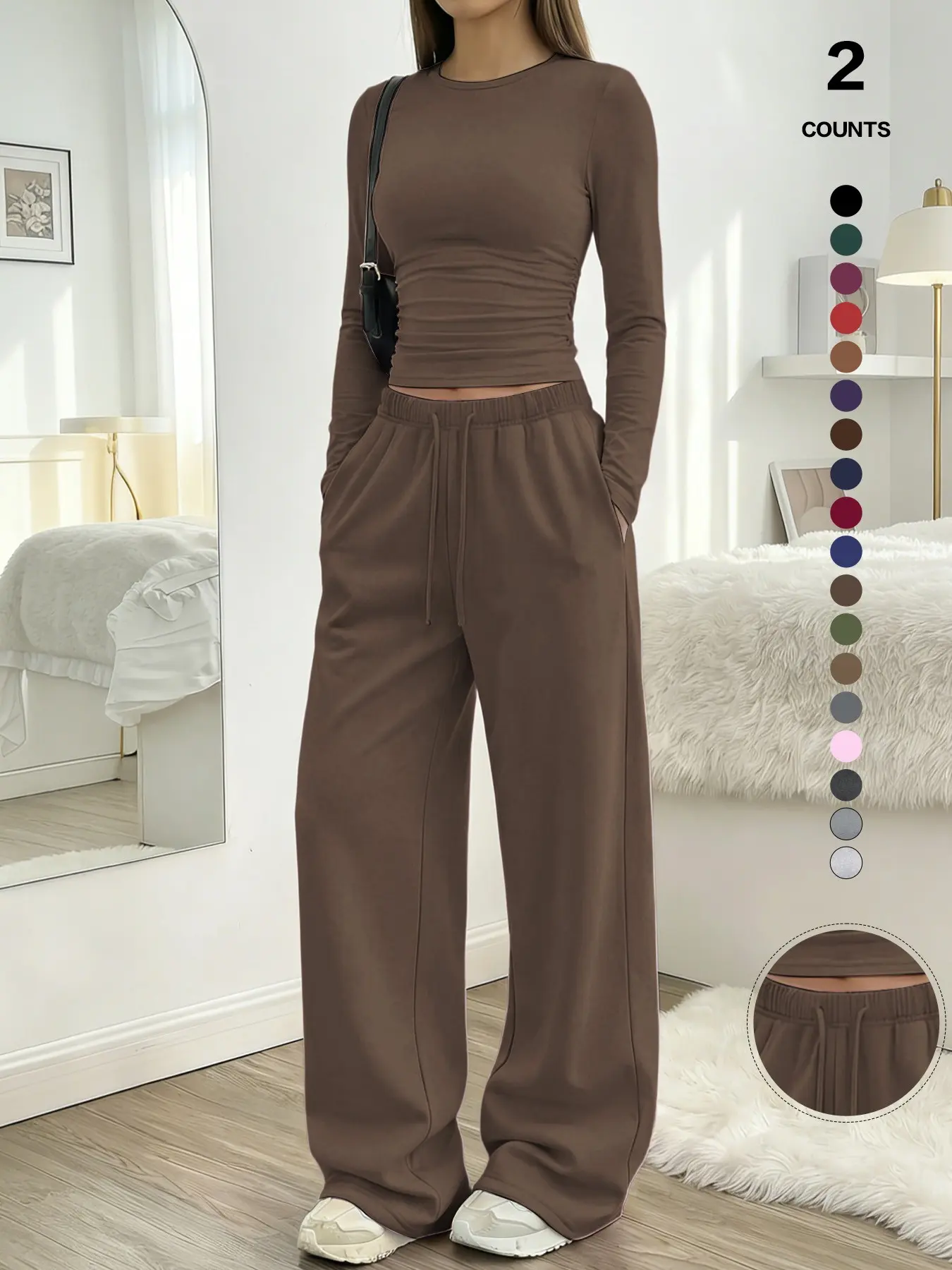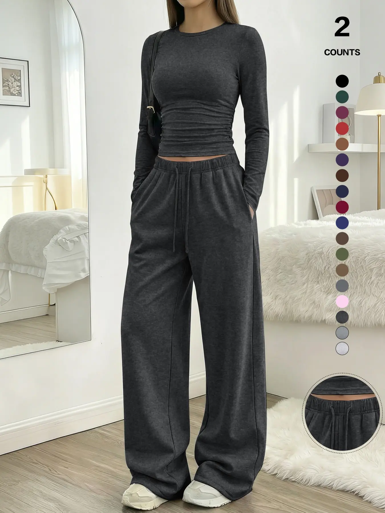 2026 Women's Two-Piece Loungewear Set, Soft Long-Sleeved Round-Neck Crop Top, Drawstring High-Waisted Wide-Leg Pants with Pockets