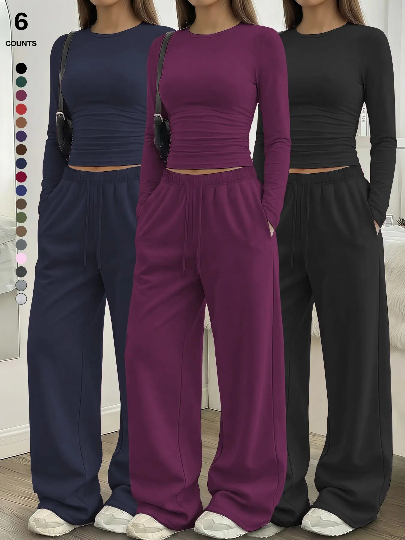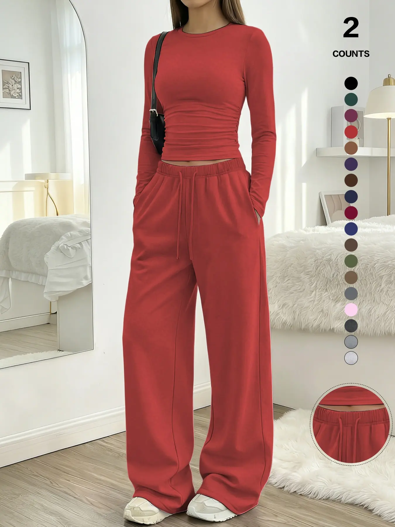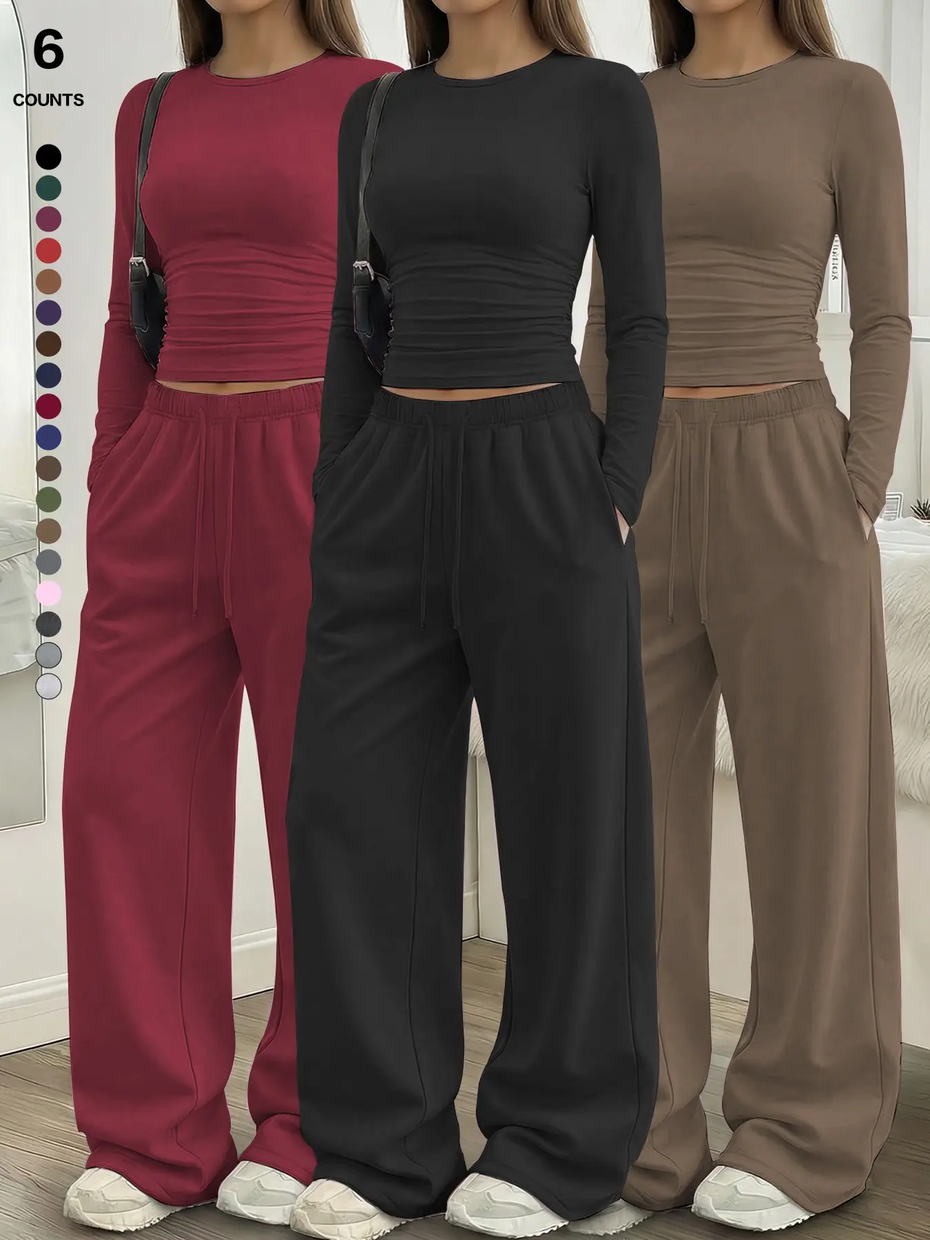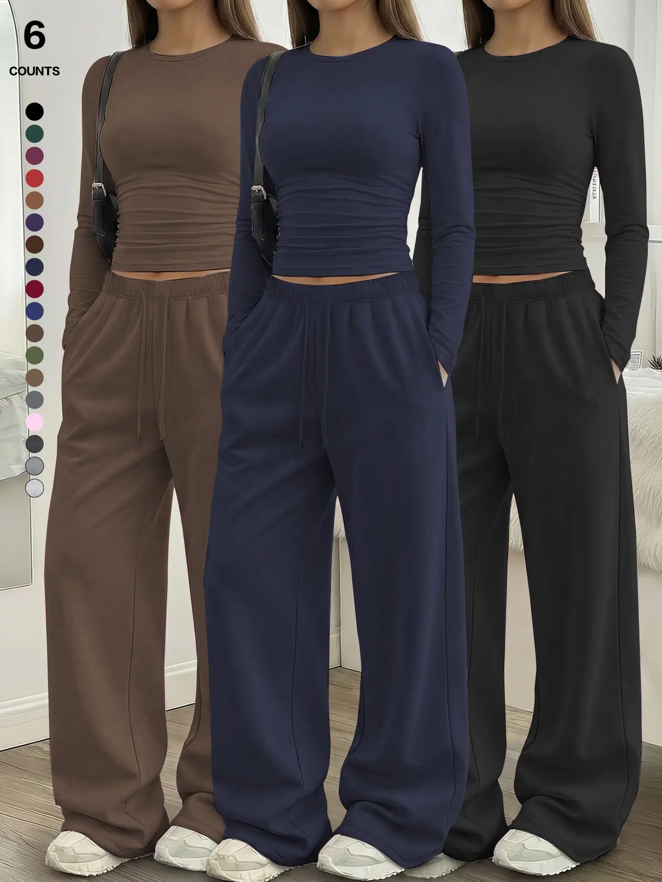 2026 Women's Two-Piece Loungewear Set, Soft Long-Sleeved Round-Neck Crop Top, Drawstring High-Waisted Wide-Leg Pants with Pockets