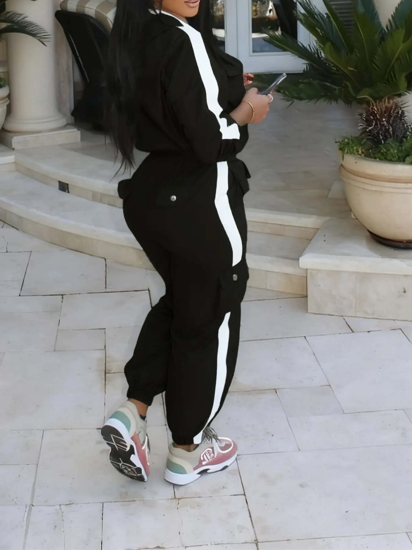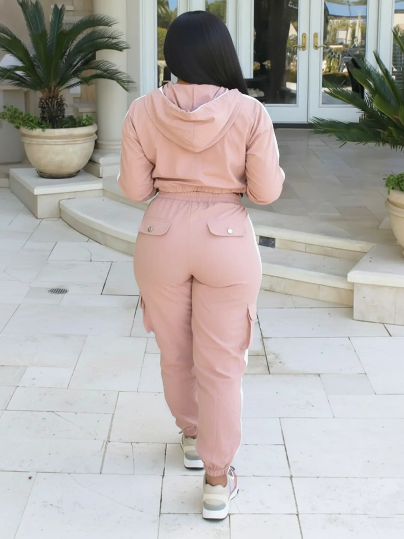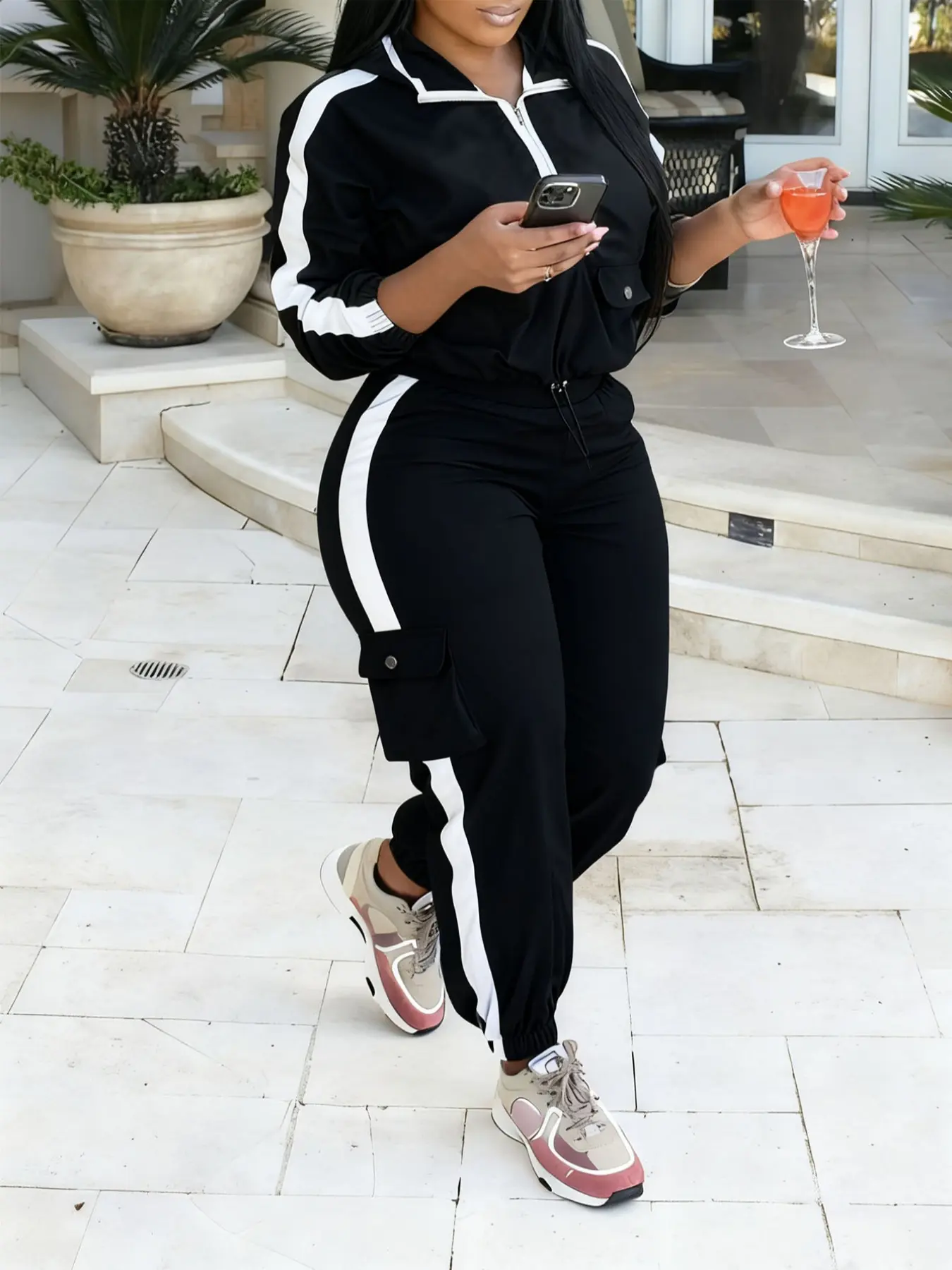 【Two-piece set】: Includes a long-sleeve zip-up windbreaker and high-waisted cargo pants for coordinated wear.