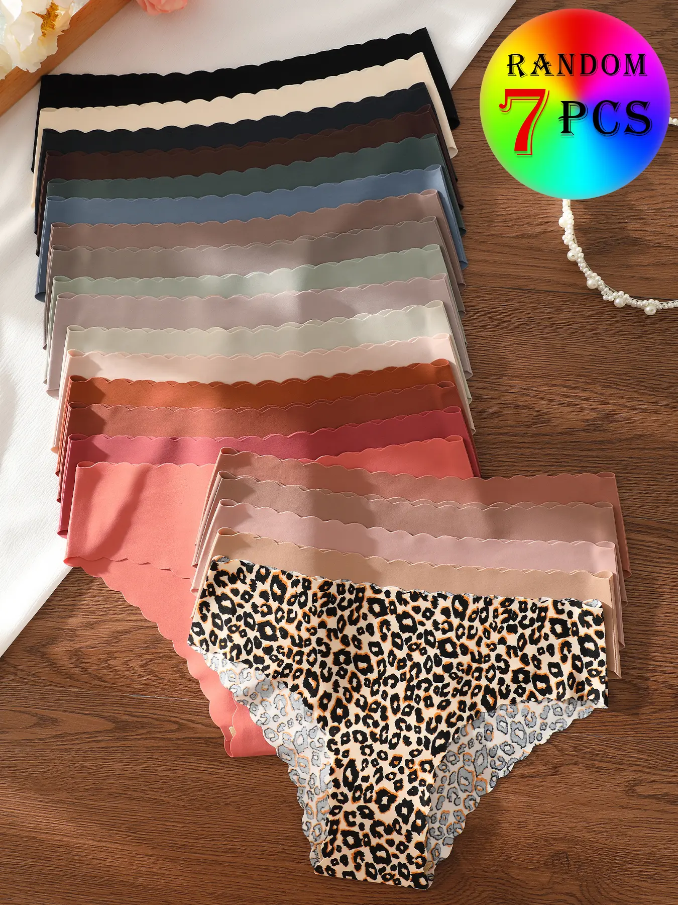 5. 7-piece set of randomly colored wave-edged seamless one-piece triangle panties, Seamless Crotch Design, leopard print and solid color mix, sexy, comfortable, stretchy, and smooth women's underwear