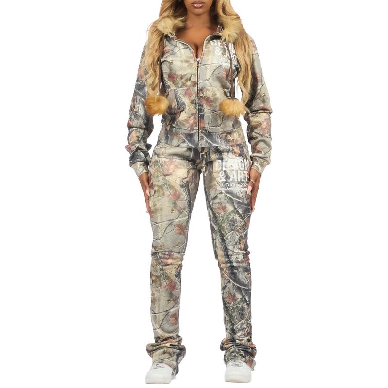 An urban two-piece jacket and super stacked track pant set for women in grey tree camo. Designed with custom detailing and extra long legs for the perfect streetwear style.