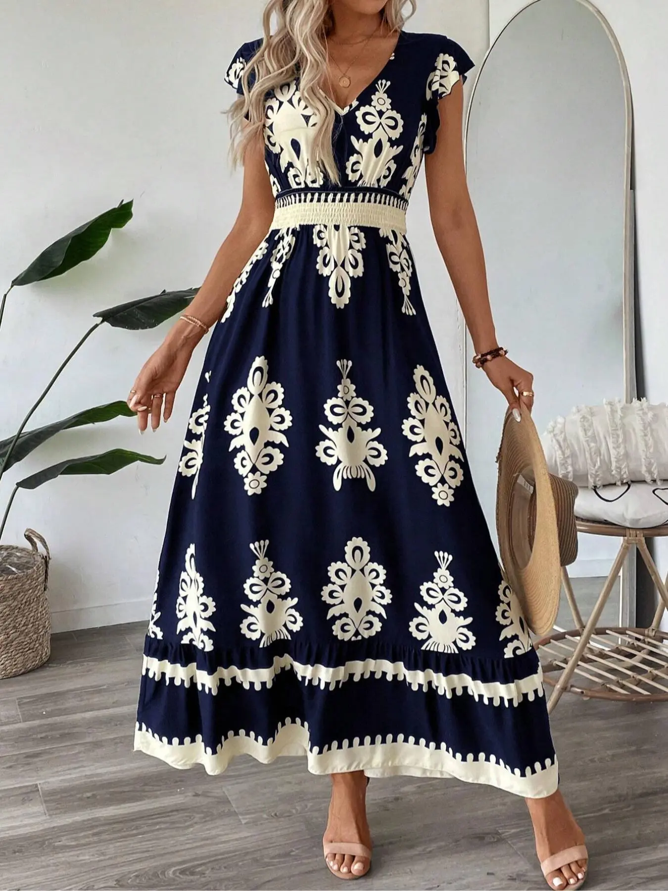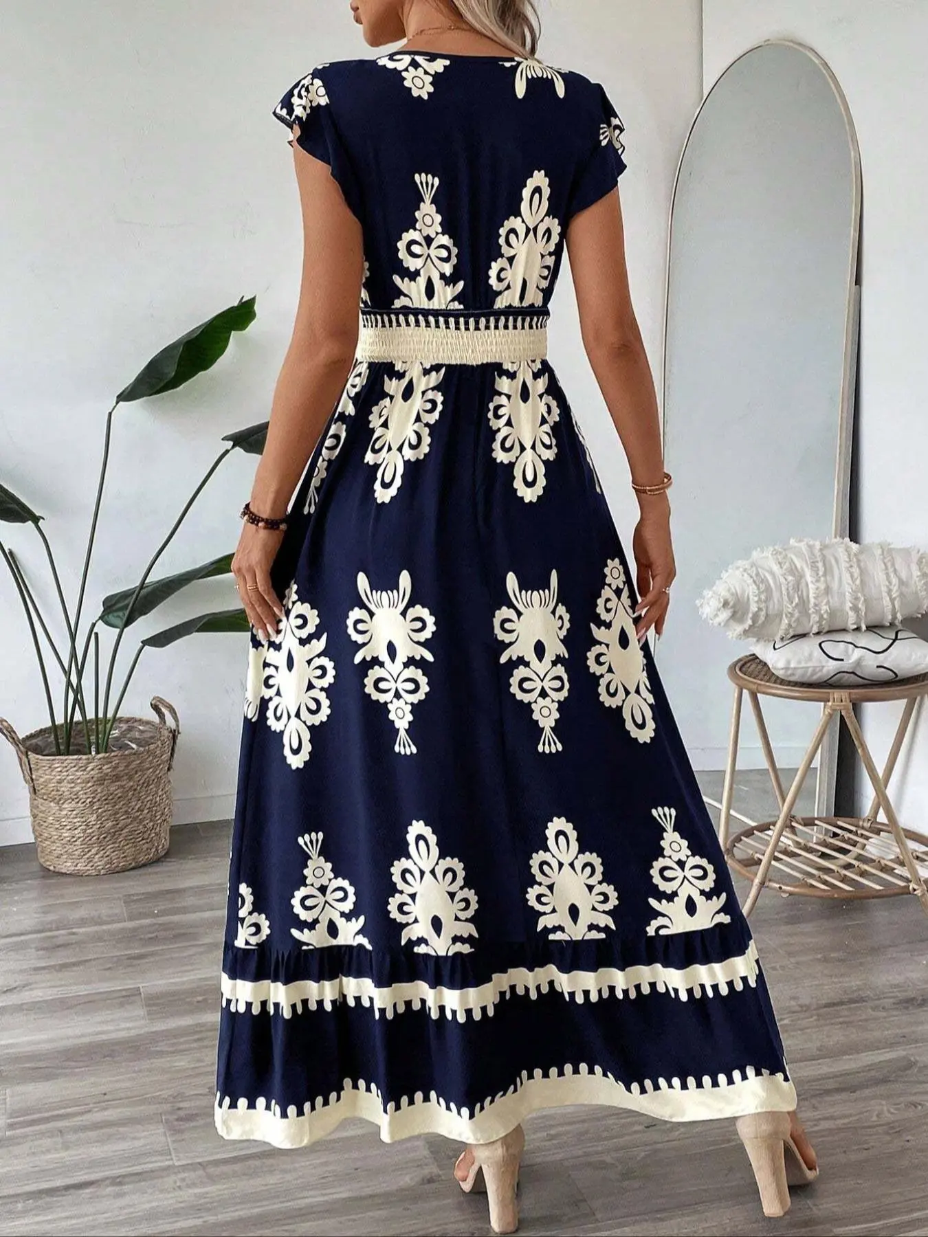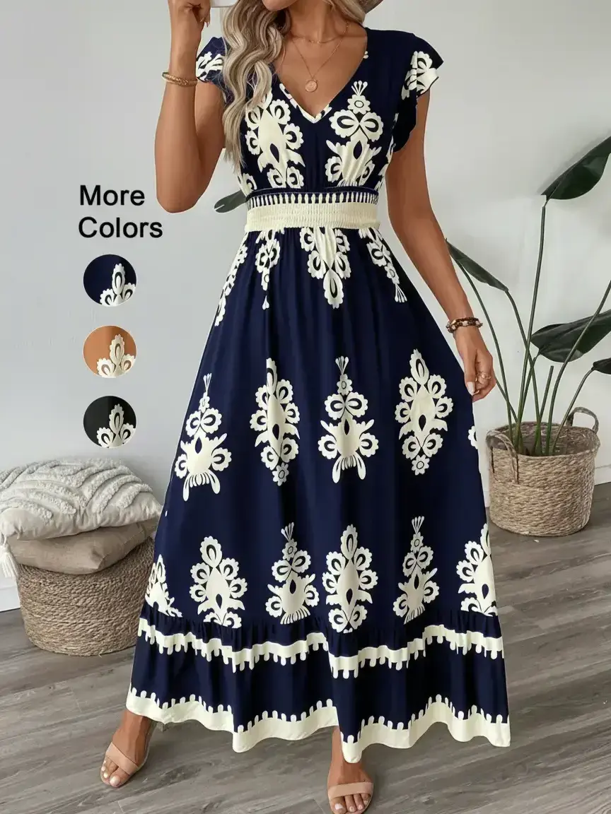 Beautiful dress! The navy blue color and floral design look elegant, and the V-neck style is very flattering. The fabric feels comfortable and the fit is perfect. Great for casual outings or special occasions. Highly recommend! ⭐⭐⭐⭐⭐
