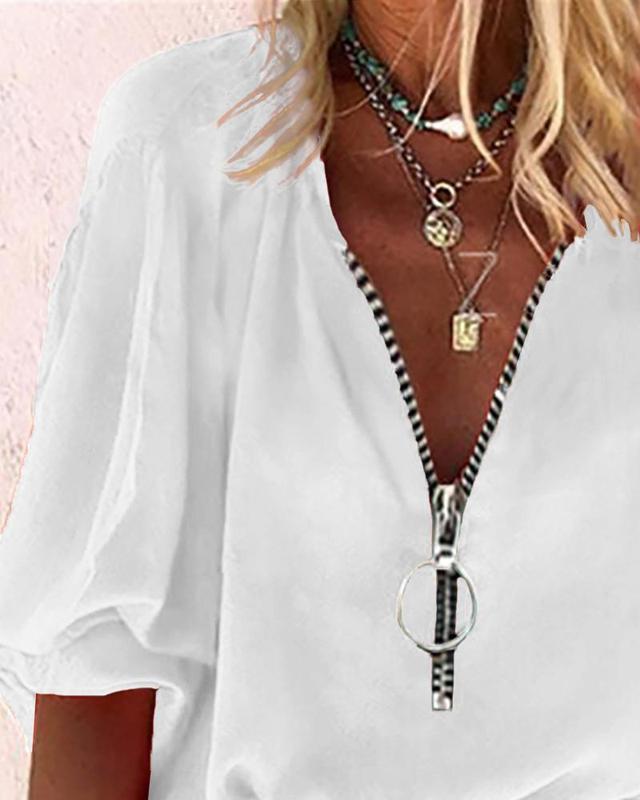 Imily Bela Womens V-Neck Lantern Sleeve Blouse Zipper Design Loose Casual Top Shirts