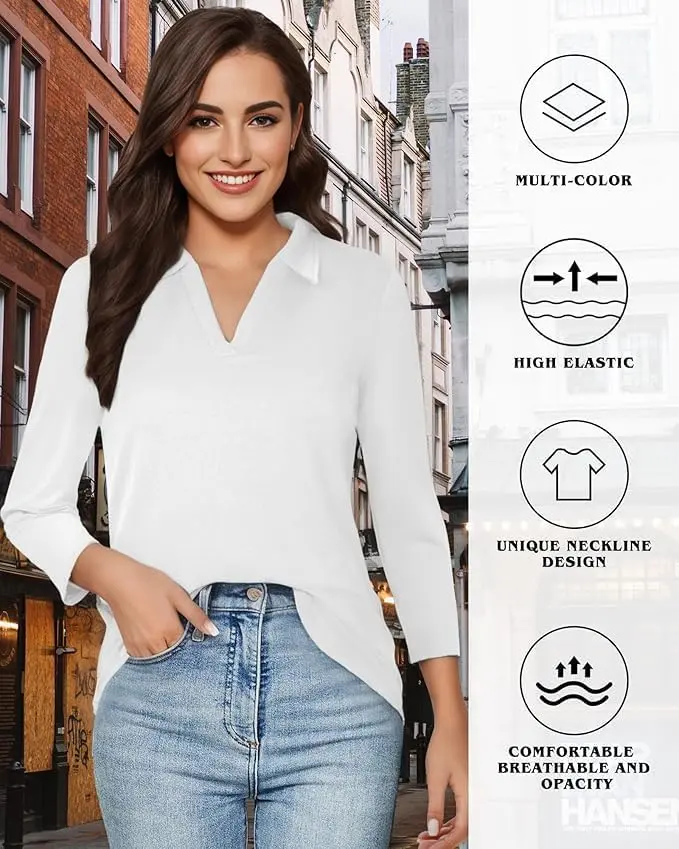 Polo Shirts for Women, V-Neck Business Casual Tops for Women, Collared Shirt Tunic Tops 3/4 Sleeve Work Blouses