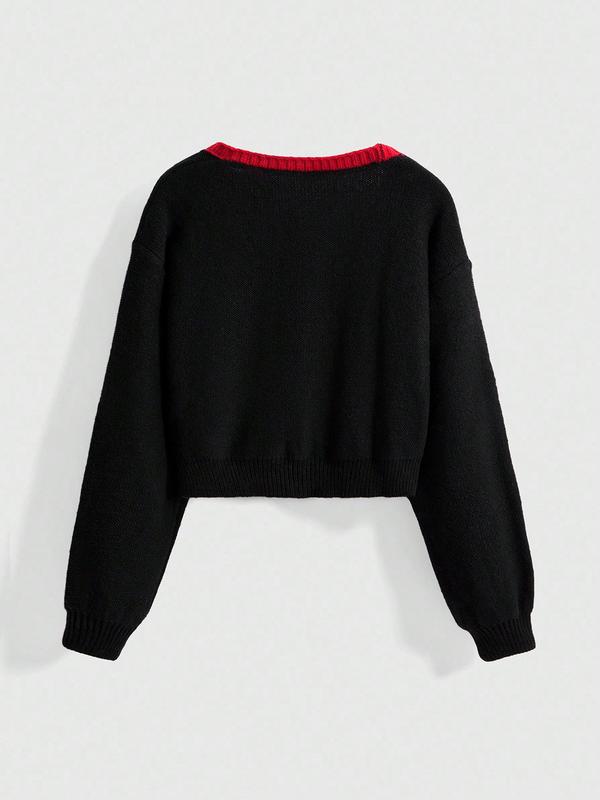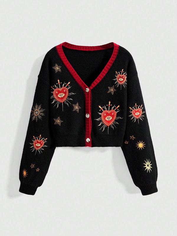 Women's V-Neck Button-Up Knit Cardigan Knitwear, Cropped Loose Fit Long Sleeve with Love Sun Star Embroidery, Ribbed Detail for Fall Winter