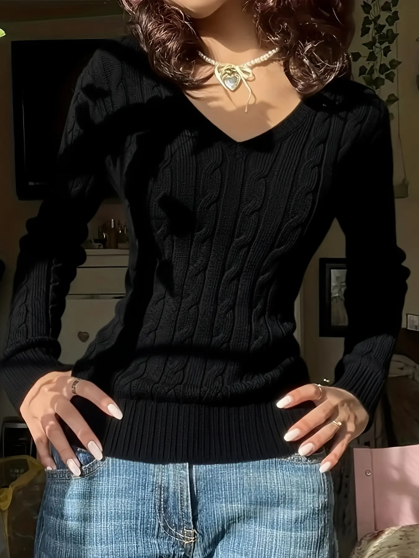 Women's V-Neck Knitted Sweater, Pure Color Slim-Fitting Top, Versatile Fall & Winter Wear, Comfortable Daily Fashion, Knitwear #sweaters #cardigans #fashionablewomensclothing #womenstees #cottonsweater #clothingbasics #vnecksweater #turtlenecksweater #cutesweaters #womenswearfashion