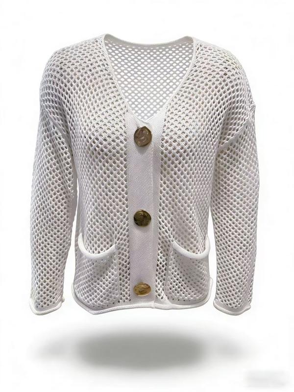 Women's Solid Color V-Neck Long Sleeve Hollow Out Button Knit Cardigan Sweater, Casual Fashion Pullover for Spring & Fall #womensfashion #sweater #clothingbasics #sweaterforwork #knittedsweaters #widenecksweater #womenswinterfashion #womenswearfashion #womenscasualfashion #wintersweater