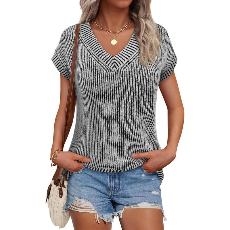 This short sleeve knit tops design with v neck and cap sleeves, soft and comfortable to wear in spring and summer.