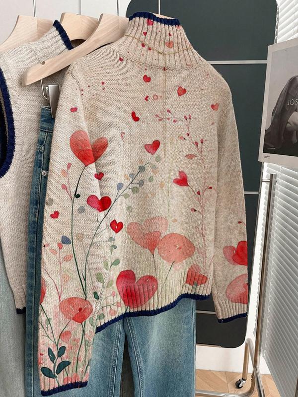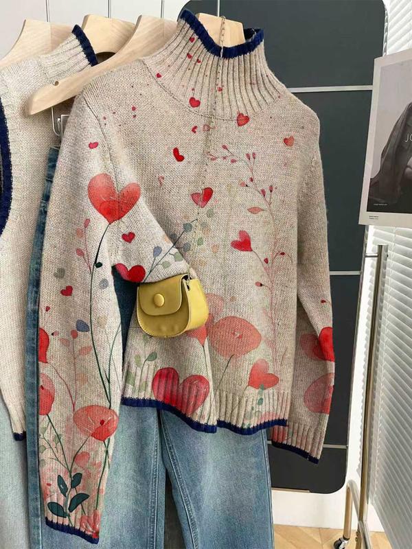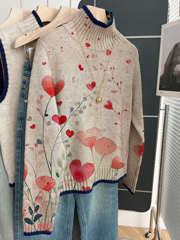 Women's Valentine's Day Knit Sweater, Heart Pattern Gradient Color Block Design, Casual Elegant Half High Neck Pullover for Spring Fall Winter