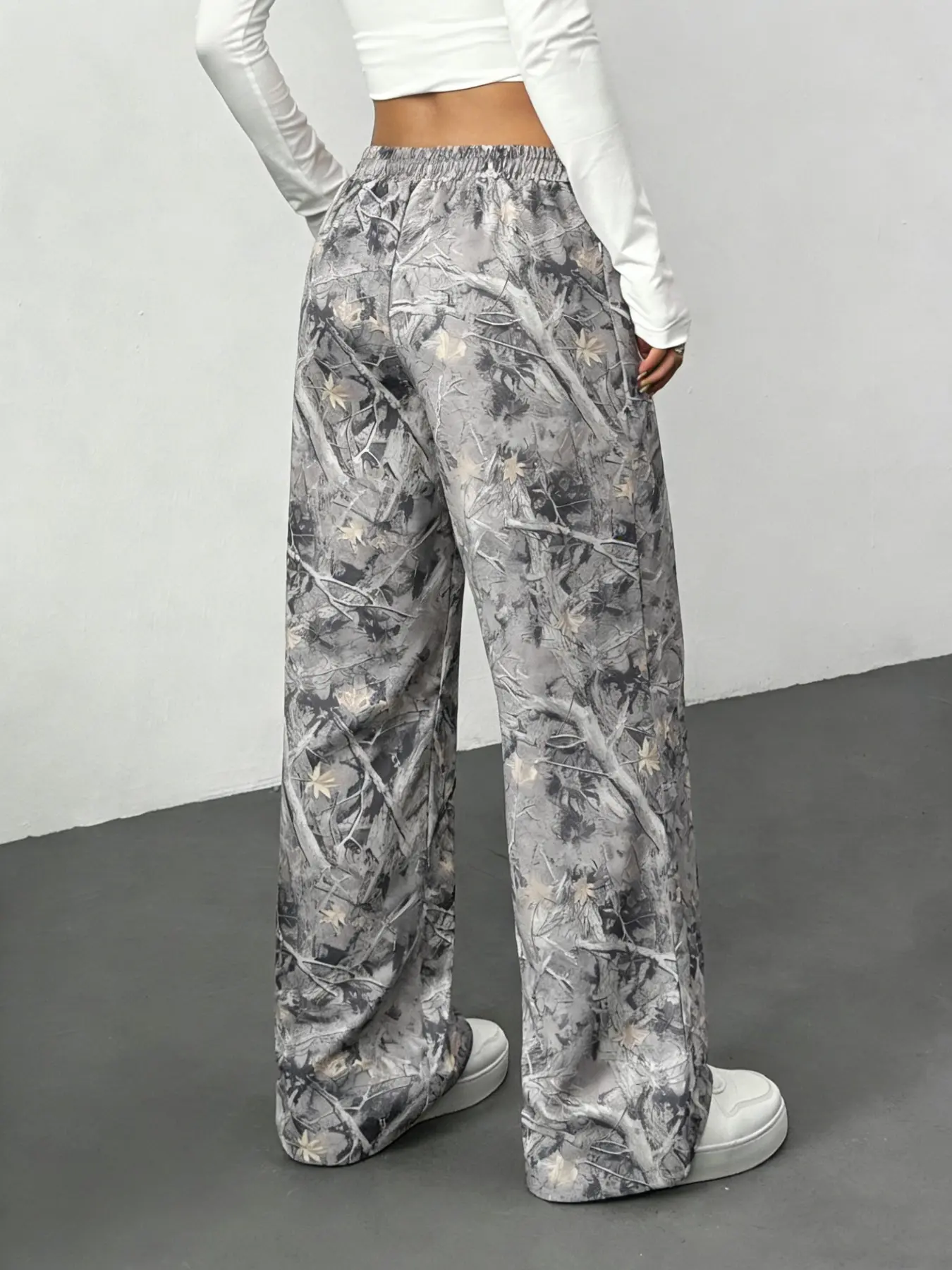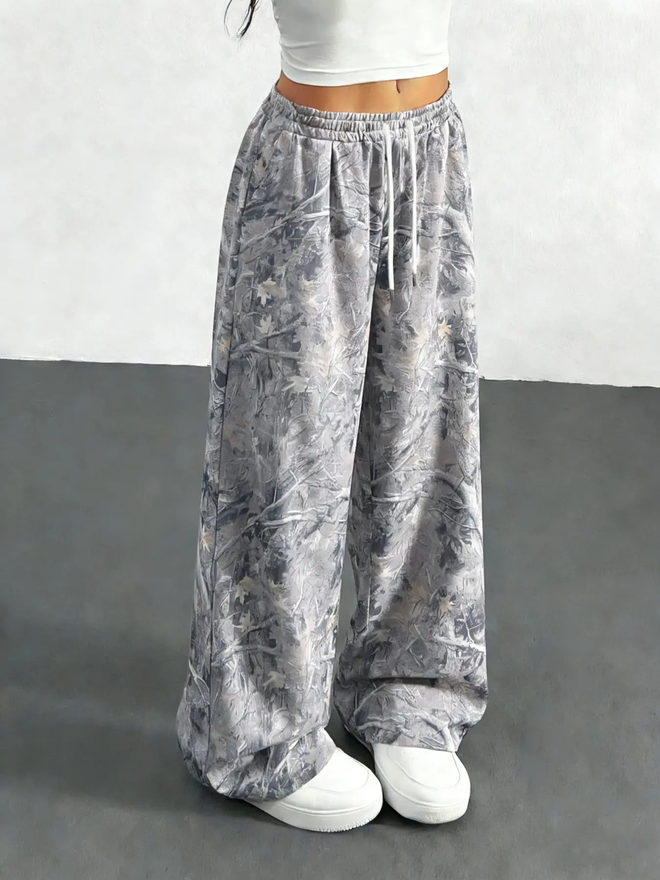Women's Vintage Street Style Camo Knit Loose Sports Pants, Drawstring Waist, Summer Branch Print, Casual Wide Leg, All Seasons, Camo Sweatpants #sweatpantsoutfit #widelegsweatpants #joggerpants #joggerset #cozyloungewearset #cargosweatpants #croppedpants #womenspantssuit #aeropostalepants #pacsunbaggyjeans