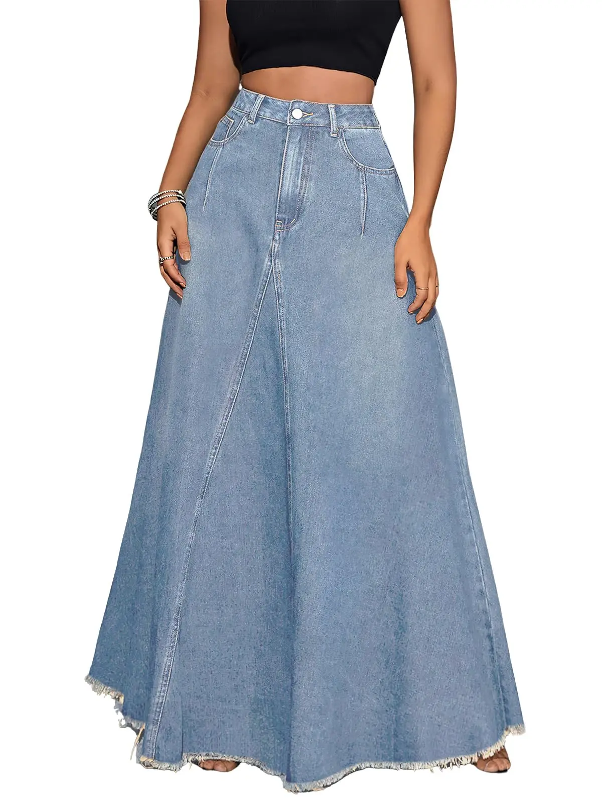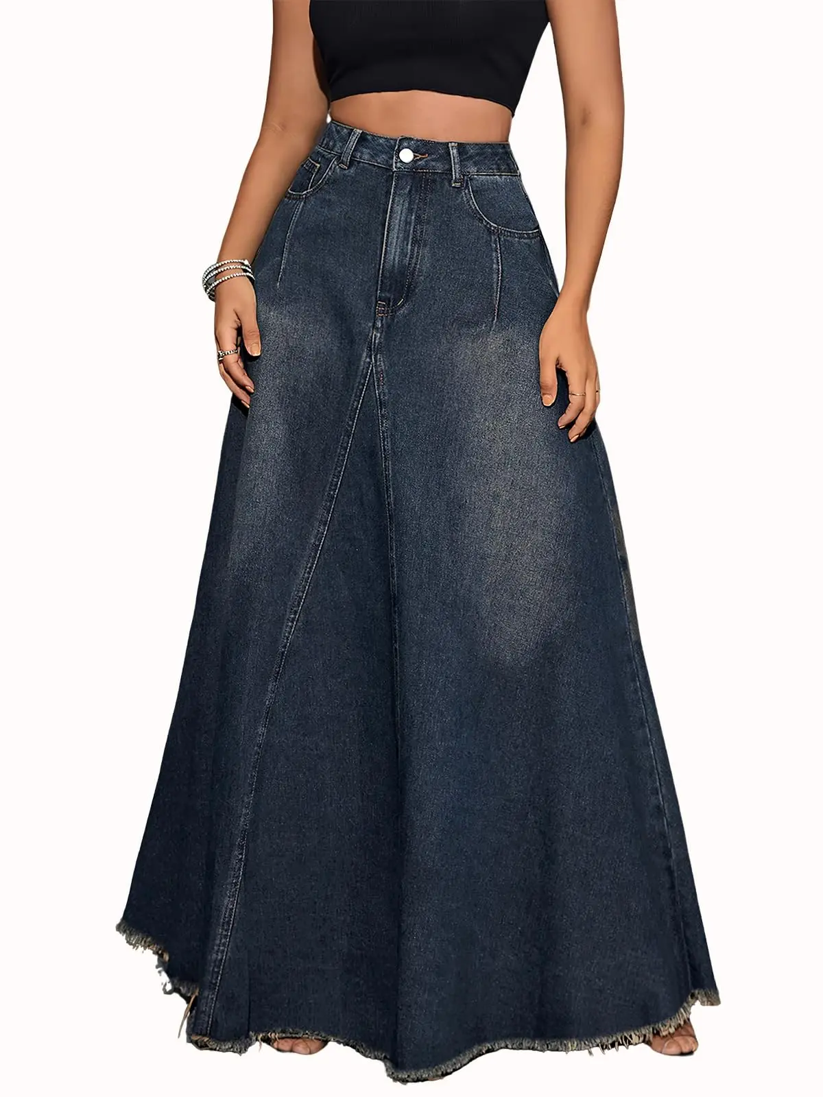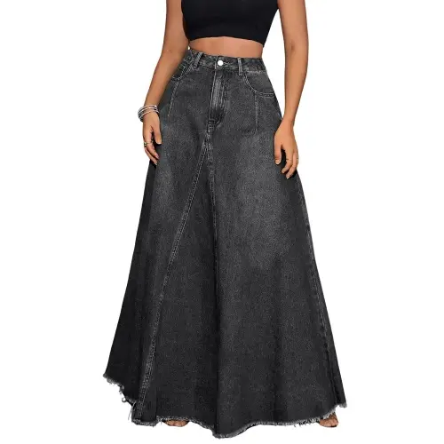 ·Features: Button ang zipper closure, high waist with belt loops, barrel jean skirt, flared a line style, flowy frayed hems, tassels, chic inverted v-shape stitching, two sides slanted pockets and two patchwork back pockets, solid color, full length