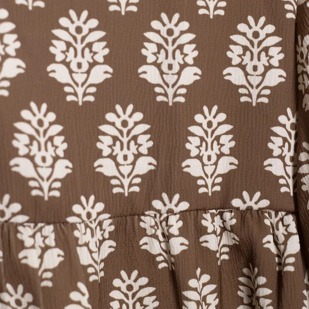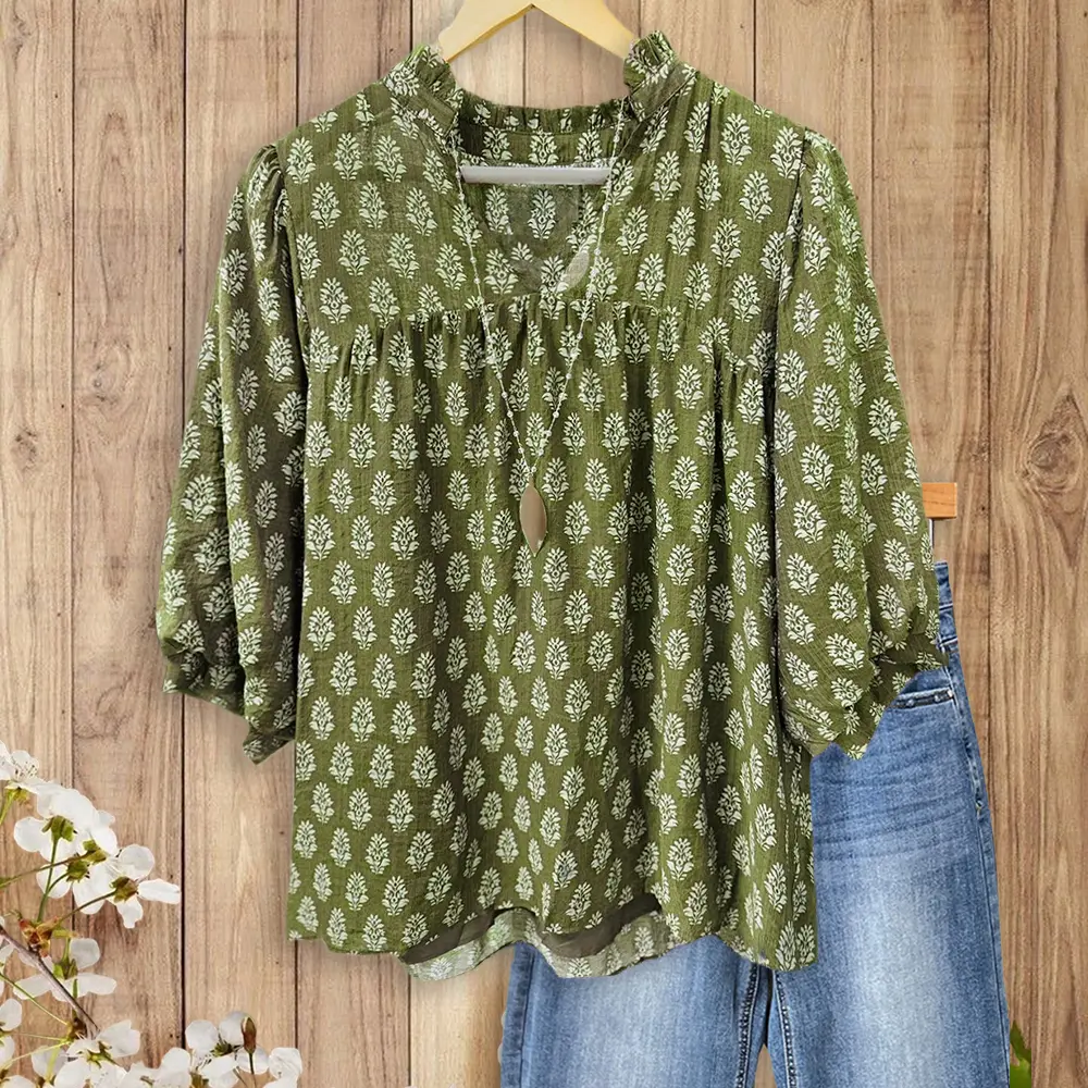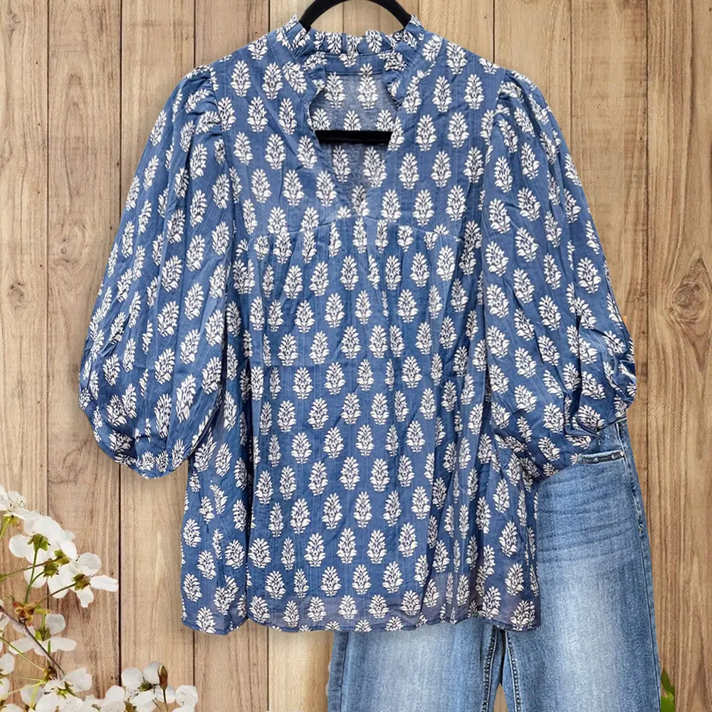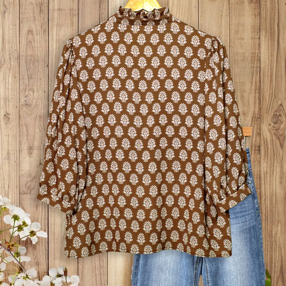 Timeless brown floral print paired with a chic V-neck. This blouse brings a touch of boho elegance to daily looks. The 3/4 puff sleeves add a feminine twist while keeping you cool in warmer weather. Perfect for casual wear, this top is ideal for busy lifestyles or laid-back outings.