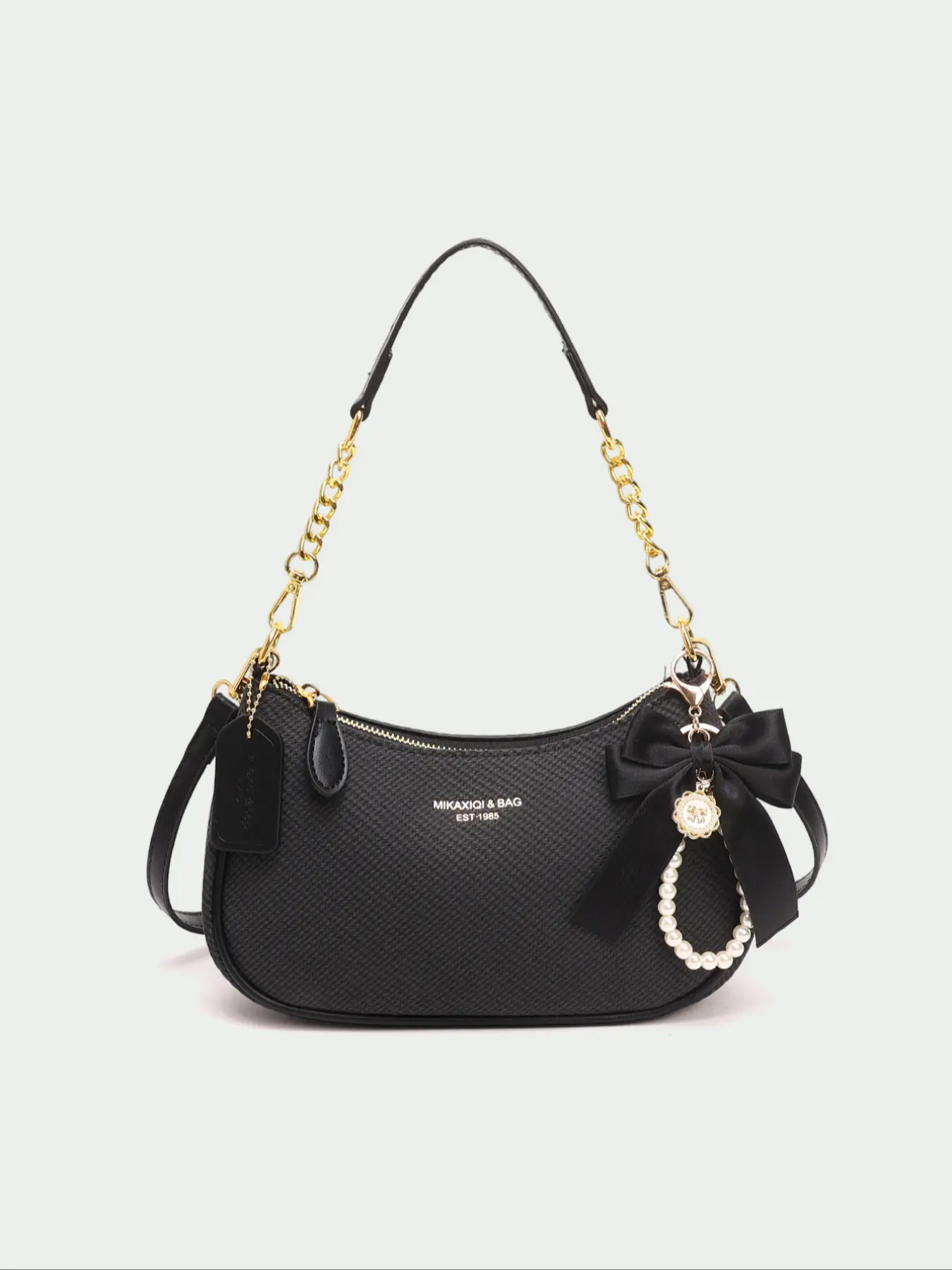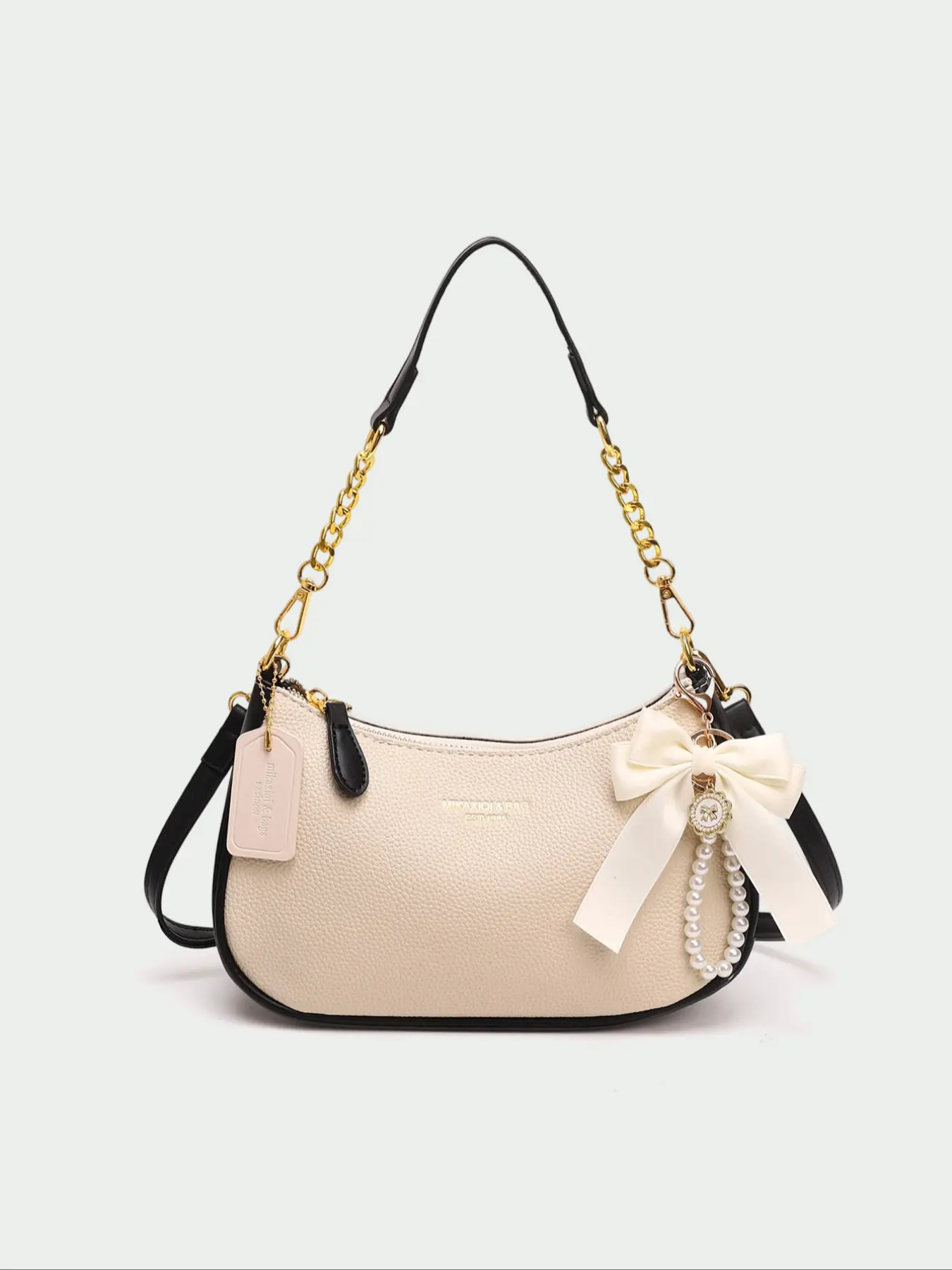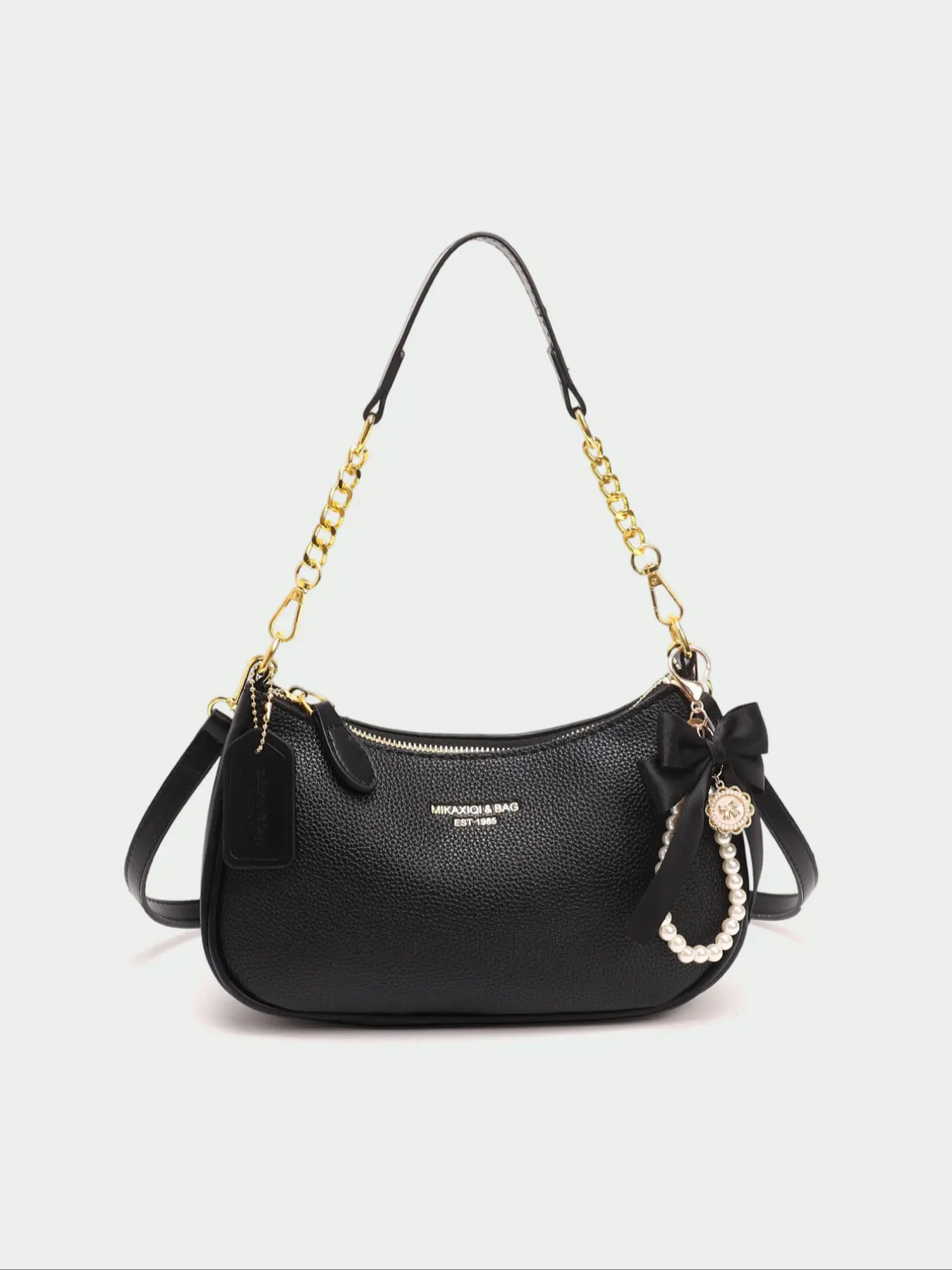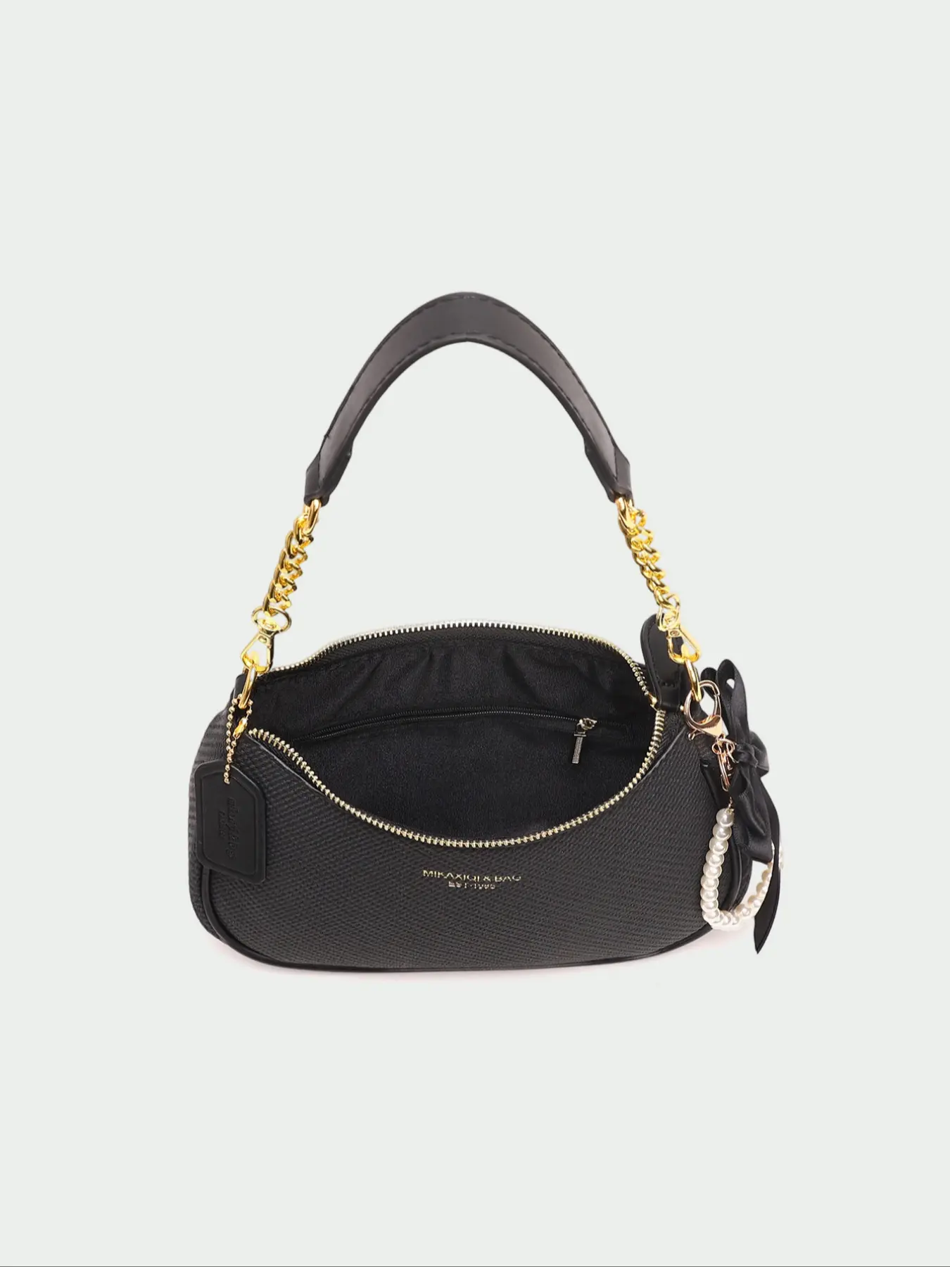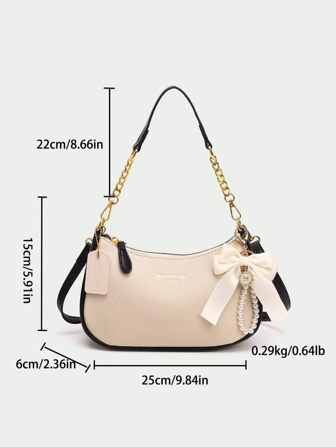 Arrived well packaged with multiple items. This bag is beautiful and I love it! It's so sleek and soft with the gold trim of the clasp and shoulder⛓️. It's divided into 2 compartments and is roomy for a small bag. This exceeded my expectations and I'm very happy with my purchase. I highly recommend this bag.